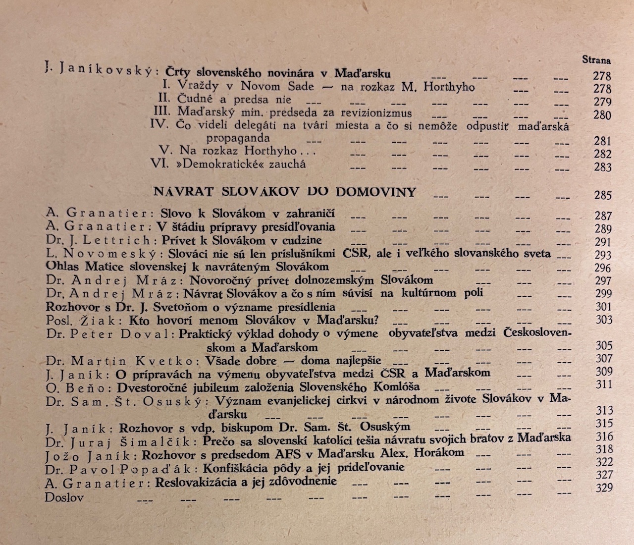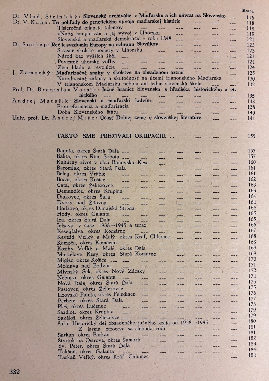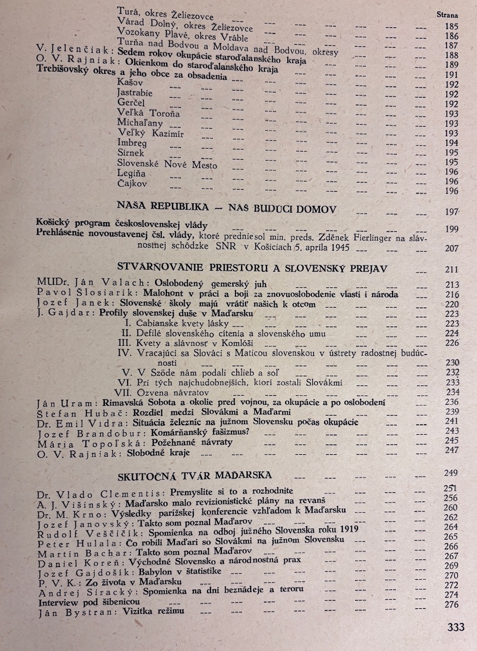 Reprezentačný povojnový almanach mapujúci udalosti rokov 1938–1945 so zameraním na oslobodenie južného Slovenska, návrat slovenského obyvateľstva, povojnovú obnovu a spoločenské pomery v regiónoch pripojených k Maďarsku Viedenskou arbitrážou. Publikácia obsahuje texty viacerých autorov o histórii, politike, kultúre a živote slovenského etnika v Dunajskej kotline od praveku až po povojnové obdobie. Obsah vychádza z myšlienky “zachytiť skutočnosti, ktoré sa odohrali okolo nás” – počas vojny, okupácie aj po nej. Obsiahly predslov vysvetľuje historický kontext, "reslovakizáciu", návrat Slovákov do domoviny a dramatické presuny obyvateľstva po roku 1945.- Vzadu rozsiehala inzertná príloha.- Väzba trochu ošúchaná, inak dobrý stav