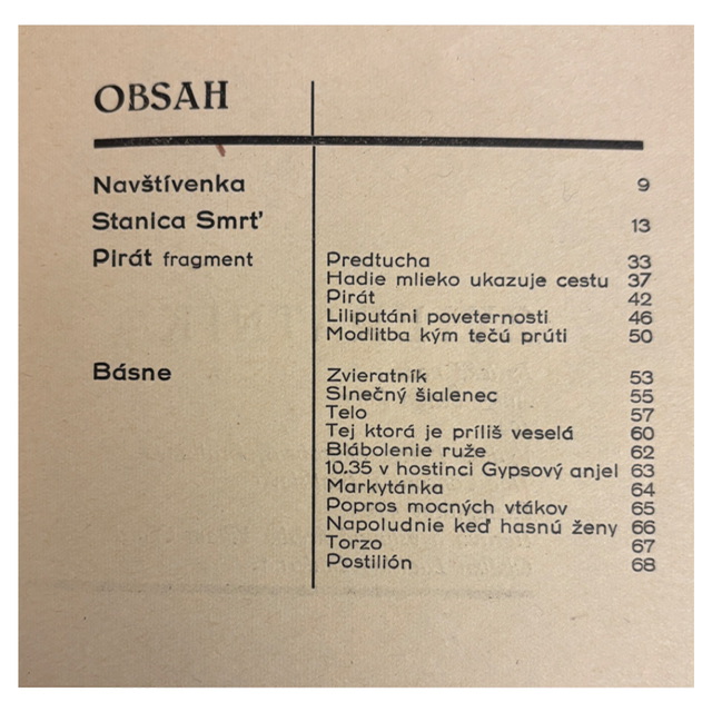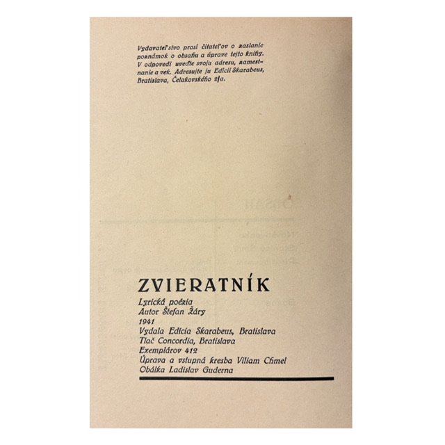 Jedna z určujúcich zbierok slovenského nadrealizmu, vydaná v mimoriadne nízkom náklade 412 kusov. Ide o edíciu, ktorá vznikla v bratislavskom prostredí malej, výtvarne orientovanej Edície Skarabeus, známej obmedzeným počtom publikovaných titulov a dôrazom na vizuálnu kvalitu. Skarabeus nebol masovým vydavateľstvom – jeho produkcia predstavuje úzky, dnes už ťažko kompletovateľný okruh modernistických tlačí zo začiatku 40. rokov.
