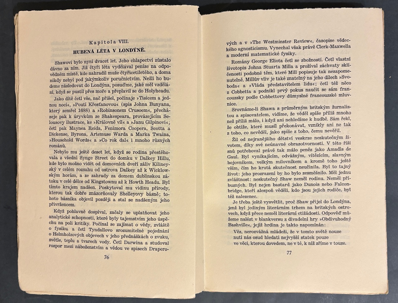 1. české vydanie.- Preklad E. Kellner.- Rozrezaním horného okraja archov prvočitateľom vznikli čiatočne tradičné voľné dvojstrany.- Papierová obálka po okrajoch a na chrbáte opravovaná, predná strana s tmavšou šmuhou. Vnútri papier v peknom stave