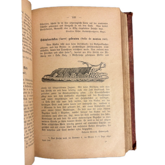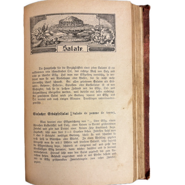 Pôvabná viedenská kuchárska kniha z konca 19. storočia, určená meštianskej domácnosti a praktickým gazdinám. Predstavuje prechod medzi tradičnou cisársko-rakúskou kuchyňou a moderným mestským varením, ponúka stovky osvedčených receptov, prehľadné usporiadanie kapitol a 74 dobových ilustrácií, ktoré dnes pôsobia ako autentický dokument každodenného života kuchyne monarchie. Publikácia je koncipovaná ako „škola varenia“ – od polievok, mäsa, rýb a zeleniny až po múčniky, pečivo a dezerty. Typická praktická príručka svojej doby, ktorá mala byť používaná, nie odkladaná – a práve preto si zachovala krásnu, živú patinu.- Mimoriadne atraktívna je pôvodná dekoratívna plátená väzba s farebnou secesnou obálkovou ilustráciou – dnes už sama o sebe malým grafickým artefaktom. Kniha však bola zjavne v kuchyni dosť požívaná,ilustrácia je slabšie vidieť, chrbát je puknutý, no blok je stále pevný, papier trochu zažltnutý, rohy obité. Odporúčame milovníkom varenia, zberateľom dobových tlačí a ako originálny historický darček s príbehom.