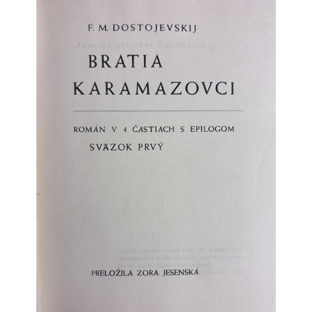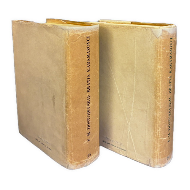 1. slovenské vydanie, v preklade Zory Jesenskej, ktorý patrí dodnes k najcennejším a jazykovo najpresvedčivejším spracovaniam Dostojevského u nás.- Kompletné dvojzväzkové vydanie (I.–II.) s pôvodnými obálkami Vincenta Hložníka.- Obálky opravované, zadná strana mierne dochytaná