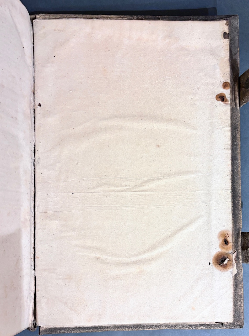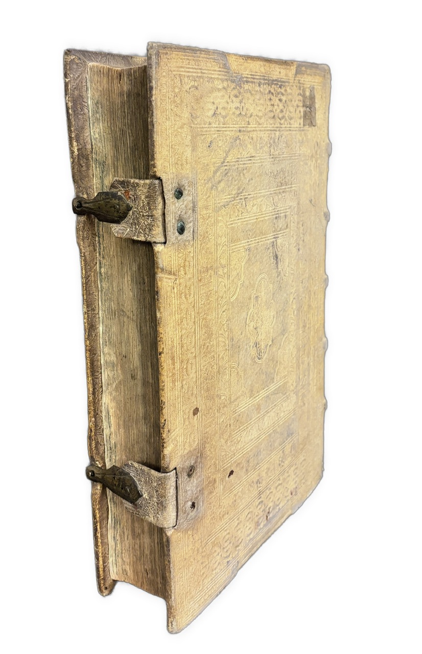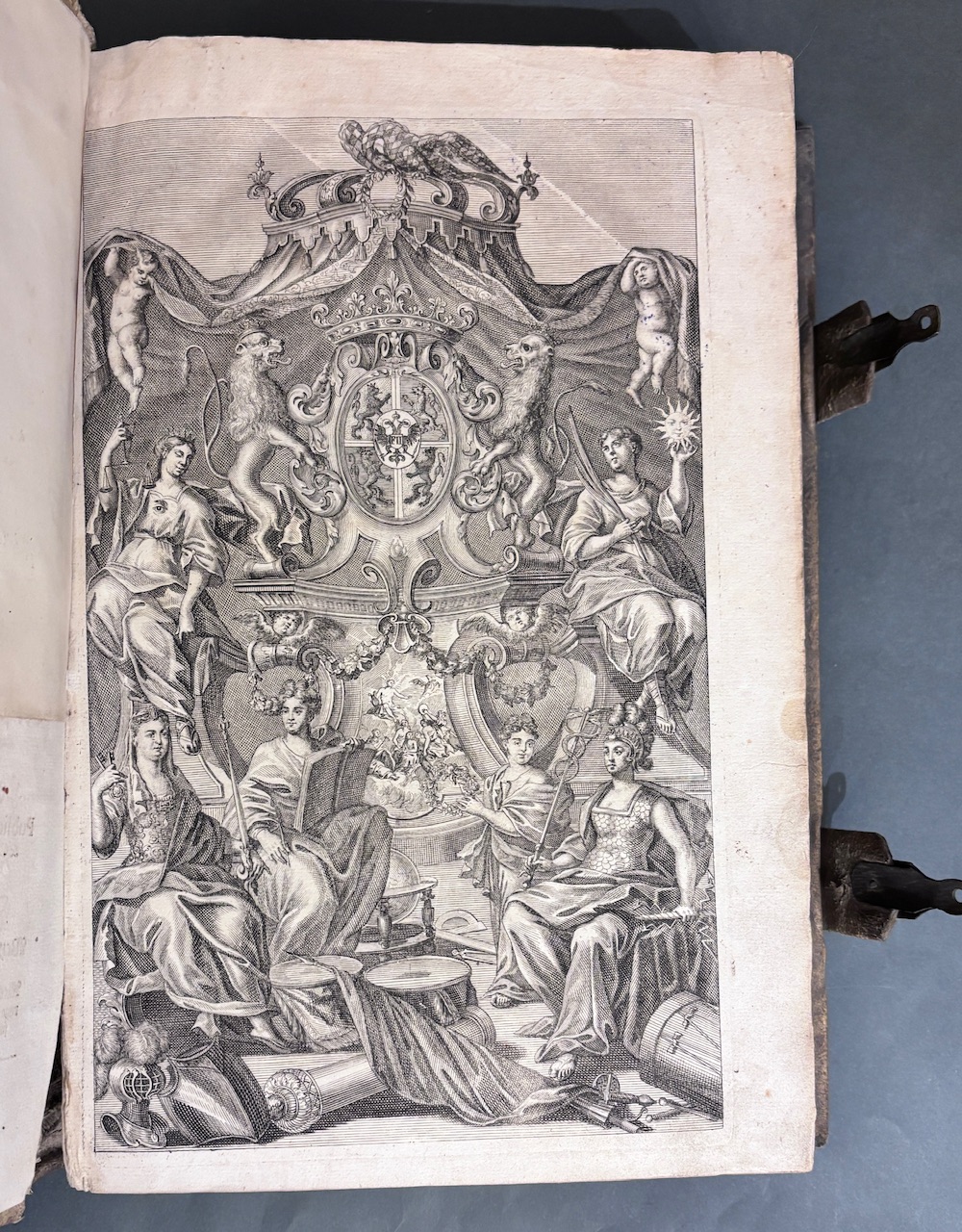 It contains extensive material relating to political, military, judicial and public law, supplemented with extracts from Landtag resolutions and hereditary privileges. The codex was compiled by Johann Jacob von Weingarten, Royal Councillor and Secretary of the Bohemian Appellate Court.- Bound in a massive period parchment binding over wooden boards, with blind-stamped panel ornamentation. The parchment is somewhat rubbed with an even, darker patina. Period metal clasps preserved. The front board is slightly loosened at the lower part near the title page, but overall the boards remain stable and the parchment is securely attached. The rear leaves show small corroded perforations caused by the deteriorated parts of the metal clasps.