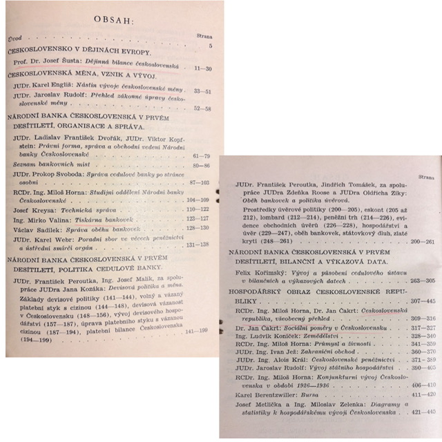 Reprezentatívna publikácia vydaná pri príležitosti prvého desaťročia existencie Národní banky Československé prináša komplexný obraz vzniku československej meny, organizácie banky, jej právneho postavenia, menovej a úverovej politiky i širšieho hospodárskeho vývoja republiky v rokoch 1926–1936. Na texte sa podieľali významné osobnosti medzivojnového ekonomického a právneho života (napr. Karel Engliš, František Peroutka, Josef Šusta a ďalší).