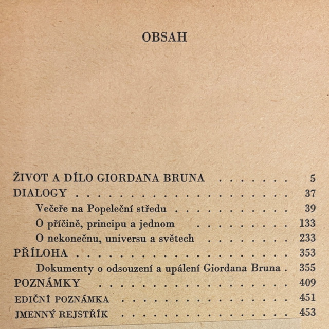 Kniha obsahuje najznámejšie Brunove texty, medzi nimi „O príčine, princípe a jednom“ a „O nekonečne, univerze a svetoch“, v ktorých autor spája metafyziku, kozmológiu a prírodnú filozofiu. Ide o fascinujúce svedectvo obdobia, keď sa rodilo moderné vedecké myslenie a zároveň sa dramaticky menila predstava človeka o mieste vo vesmíre.