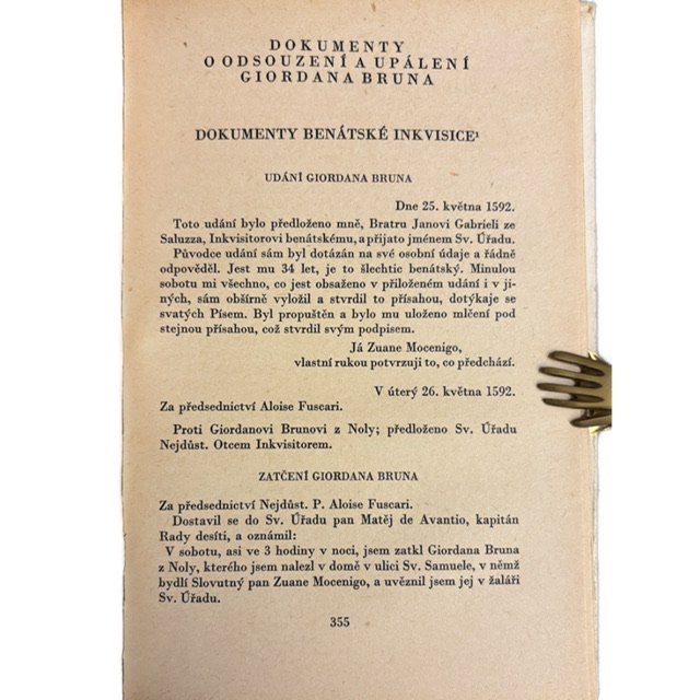 Osobitnú hodnotu tohto vydania predstavuje rozsiahla dokumentárna príloha obsahujúca texty o procese a odsúdení Giordana Bruna inkvizíciou. Vďaka nim kniha presahuje rámec filozofického diela a stáva sa aj historickým prameňom k jednému z najznámejších konfliktov medzi slobodou myslenia a náboženskou autoritou v európskych dejinách.