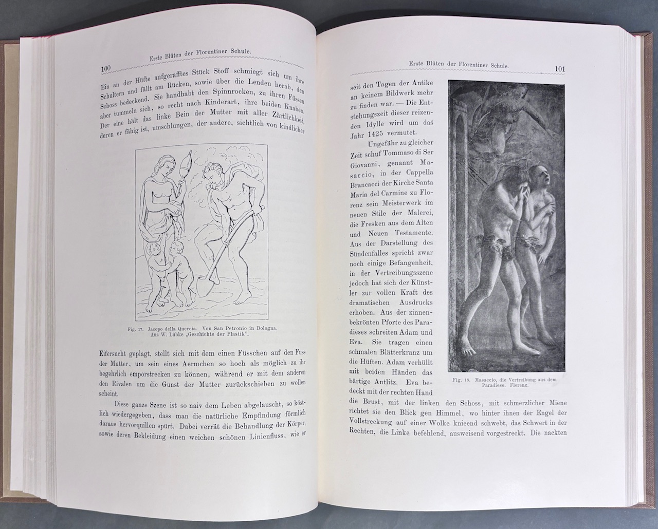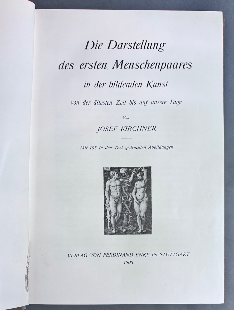 Wissenschaftliche Studie des deutschen Kunsthistorikers Josef Kirchner, die sich mit der ikonographischen Entwicklung der Darstellung von Adam und Eva – des ersten Menschenpaares – in der bildenden Kunst von den ältesten Zivilisationen bis in die Moderne befasst. Der Autor analysiert die biblischen, allegorischen und symbolischen Interpretationen des Motivs in Malerei, Skulptur und Relief. – Mit 105 schwarzweißen Reproduktionen von Kunstwerken – Adam und Eva in der Ikonographie von der Antike bis zum 19. Jahrhundert. – Originaler Leineneinband mit schwarzem Druck und Illustration auf dem Vorderdeckel. – Vordere Vorsatzseite im unteren Bereich des Titelblatts leicht gelockert, sonst sehr guter Zustand