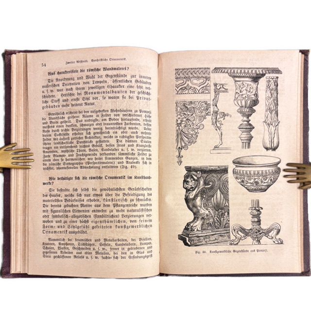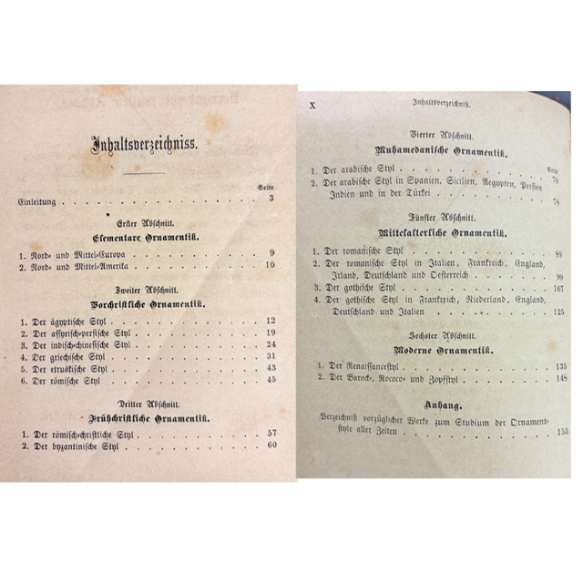 Bohato ilustrovaný prehľad dejín ornamentu od staroveku po 19. storočie. Autor systematicky predstavuje egyptský, asýrsko-perzský, grécky, rímsky, románsky, gotický až po renesančný a barokový štýl. Publikácia slúžila ako praktická príručka pre študentov umenia, architektov a remeselníkov – čo je cítiť aj z množstva detailných kresieb a ukážok dekoratívnych prvkov.