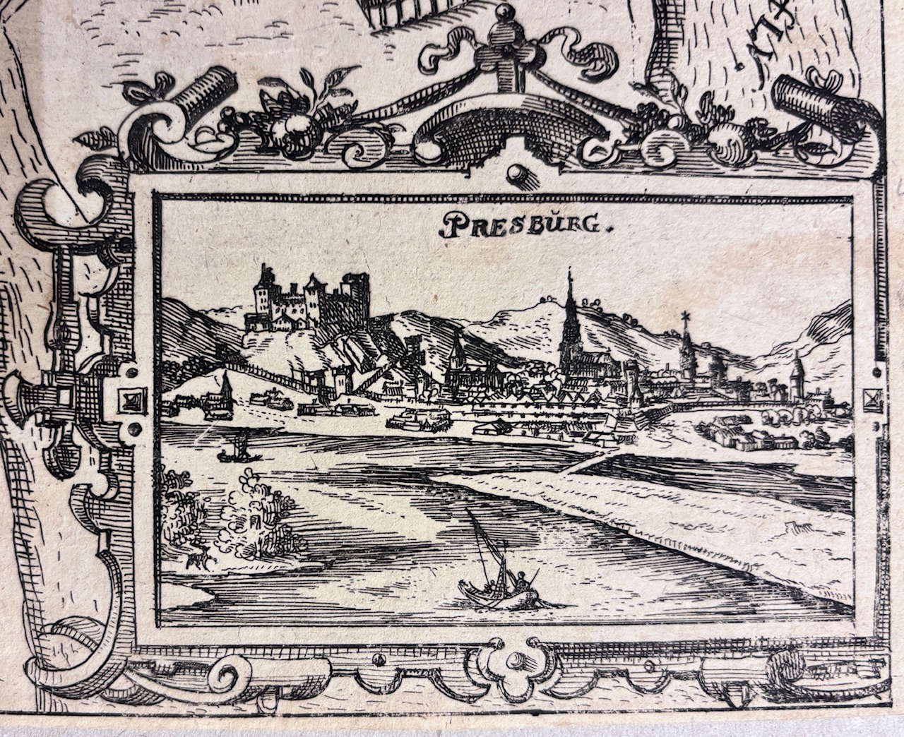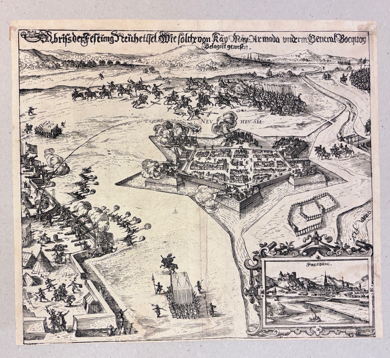 Orig. mediryt zachytáva obliehanie pevnosti Nové Zámky (vtedy Neuhausel) cisárskymi vojskami pod velením generála Georga Baucquoysa počas protitureckých vojen v 17. storočí. Kompozícia z vtáčej perspektívy zobrazuje intenzívnu bojovú scénu – výbuchy diel, obliehacie línie, tábory, ako aj obranné valy a priekopy okolo šesťuholníkovej pevnosti. V pravom dolnom rohu je umiestnená menšia veduta s nápisom PRESBURG, predstavujúca pohľad na Bratislavu z južnej strany s hradným vrchom a panorámou mesta. Tento doplnkový výjav vytvára širší geografický kontext obliehania – ukazuje polohu strategicky významných miest v hornom Uhorsku počas konfliktov s Osmanskou ríšou. Mediryt vytvoril Eberhardom Kieserom, významný nemecký grafik pôsobiaci vo Frankfurte, známy sériami vojenských a mestských vedút. Jeho diela boli často súčasťou historických zbierok alebo cyklov zachytávajúcich udalosti Tridsaťročnej vojny a uhorsko-tureckých bojov.- V bielej pasparte z tvrdšieho kartónu.- Rozmer listu:32 x 28,2 cm, rozmer tlačenej plochy: 30,8 x 27, rozmer pasparty: 45x 41,5 cm.- Stred listu zo zadnej strany profesionálne spevnený, malé dierky na tomto sklade vyplnené, užší orez na spodnej hrane, no list zachytený kompletne