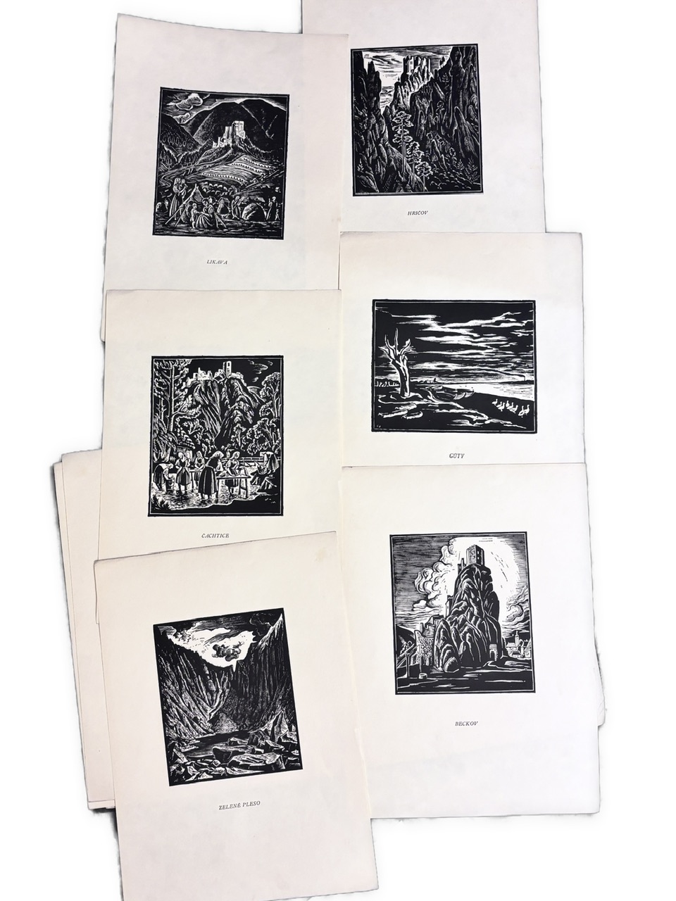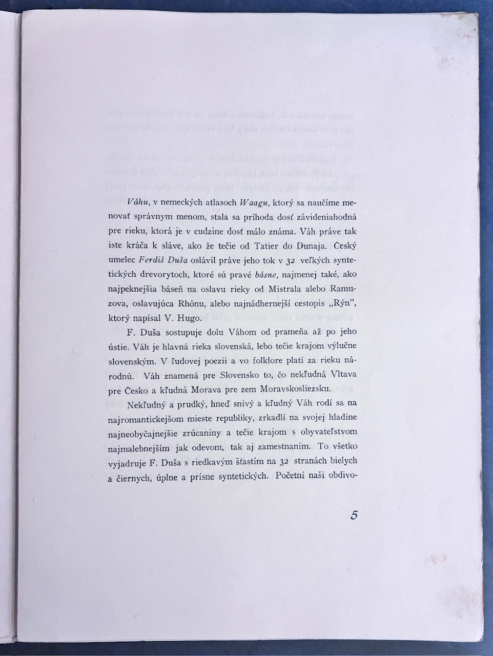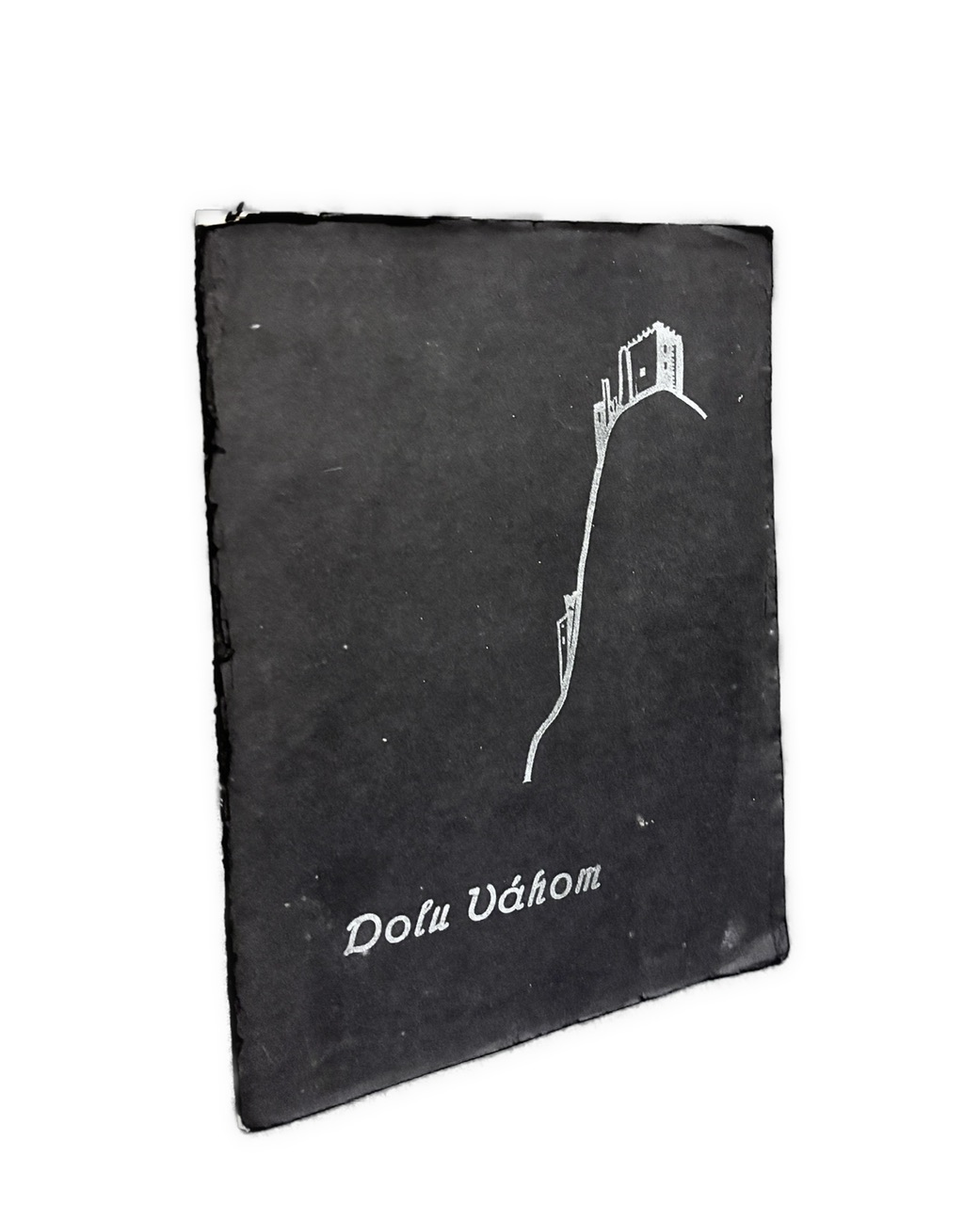 Súkromná tlač - ukážka z diela F. Dušu - R. Kratochvíla Dolu Váhom pre učastníkov bibliofilského večera 4. nov. 1933.- 6 ČB drevorytov od Ferdiša Dušu.- Číslovaný výtlačok 100. Tlačené na semillejapane, písmom garmond Mediaeval.- Grafiky sú ložené ako samostatné listy.- Orig. obal po okrajoch a na chrbáte výraznejšie ošúchaný, chrbát zvnútra podlepený, začiatočné spodné rohy papiera s otlačkami prstov, posledná grafika a strana impresa s oslím uškom v dolnom rohu