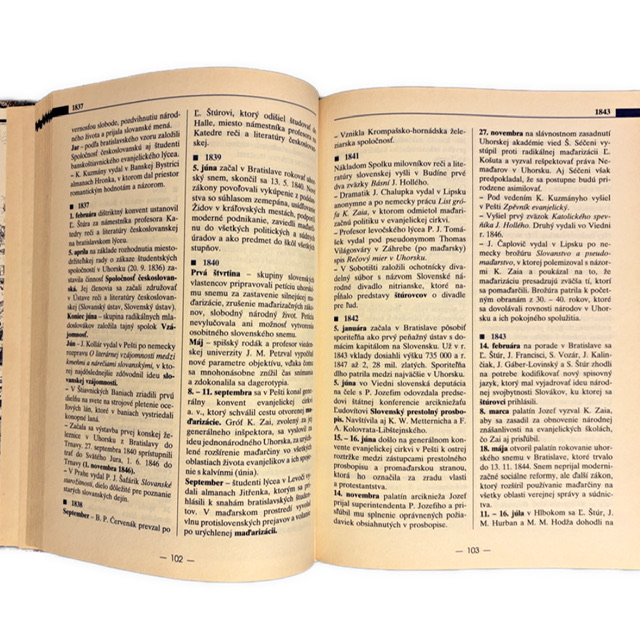 2.,doplnené vydanie, ktoré zohľadňuje vývoj historiografie po roku 1989 a aktualizuje chronologický prehľad až do roku 1998.- Publikácia je viazaná v pevnej polokoženkovej väzbe s dekoratívnym zlatým pásom a slepotlačou, čo jej dodáva reprezentatívny a nadčasový vzhľad. Pôsobí ako seriózna referenčná kniha, ktorá má svoje miesto v domácej knižnici či pracovni.