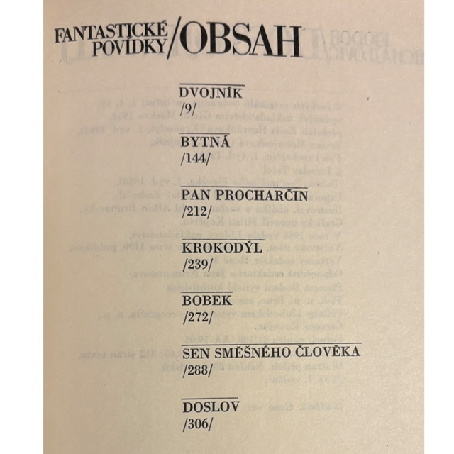 Staršie, dnes už zberateľsky obľúbené vydanie výberu kratších próz, sústredené na jeho najfantastickejšie a najbizarnejšie texty – Dvojník, Bytná, Krokodýl, Bobek, Sen smiešneho človeka a ďalšie. Ide o Dostojevského v najostrejšej podobe – rozpad identity, dvojníctvo, absurdita, čierny humor, groteskné situácie na hrane sna a šialenstva. Texty, ktoré už jasne predznamenávajú Zápisky z podzemia či veľké romány. Toto vydanie je však výnimočné najmä výtvarnou stránkou. Knihu kompletne ilustroval Albín Brunovský – jeho expresívne, mierne znepokojivé grafiky pôsobia ako samostatné umelecké diela a vytvárajú silnú, temnú atmosféru. Zväzok tak nepôsobí len ako čítanie, ale skôr ako malá galéria grafiky medzi doskami. Práve kombinácia svetovej klasiky a Brunovského robí z knihy atraktívny kúsok pre zberateľov českých a slovenských ilustrovaných vydaní 60. rokov.- Odporúčame milovníkom Dostojevského, zberateľov ilustrovaných kníh, fanúšikov Brunovského, ale aj ako výrazný dar pre niekoho, kto má rád temnejšiu, inteligentnú literatúru.