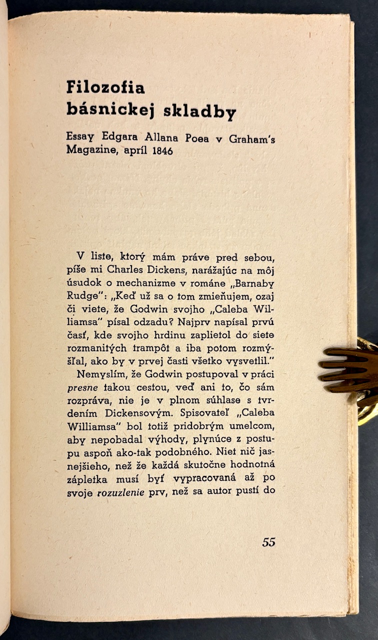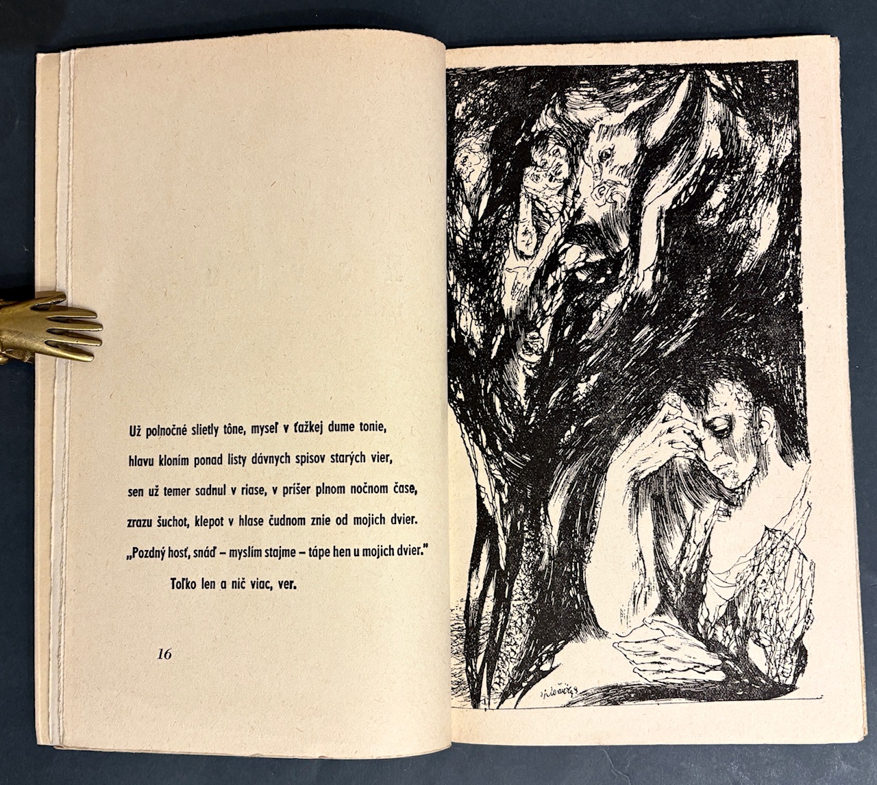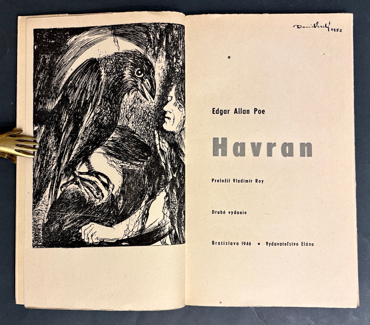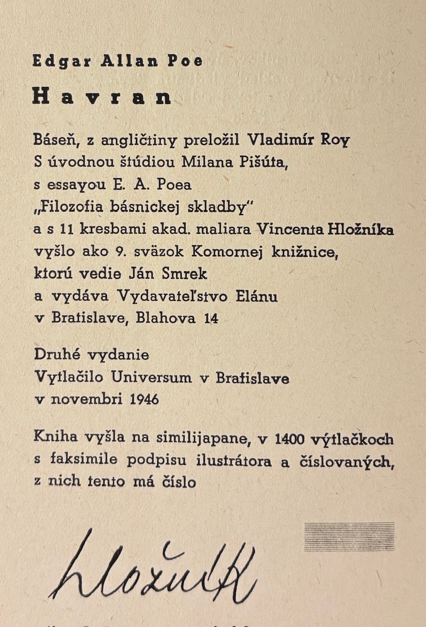 2. vydanie.- Edícia Komorná knižnica, zv. 9.- S vlastnoručným podpisom Vincenta Hložníka v tiráži a jeho ILU na obálke a ďalšími 11 čb ILU. S úvodnou štúdiou Milana Pišúta a essayou E.A. Poea Filozofia básnickej skladby, napísaná v apríli 1846.- Preklad Vladimír Roy.- Malý súkr. podpis v roku titulného list a malá exlibris pečiatka na predsádke, inak pekný stav