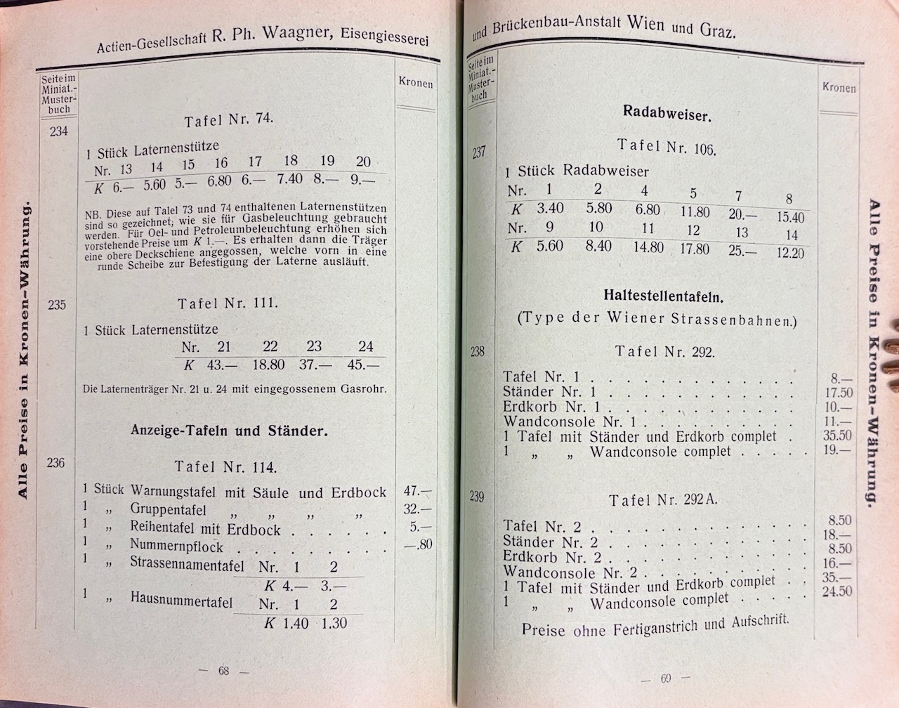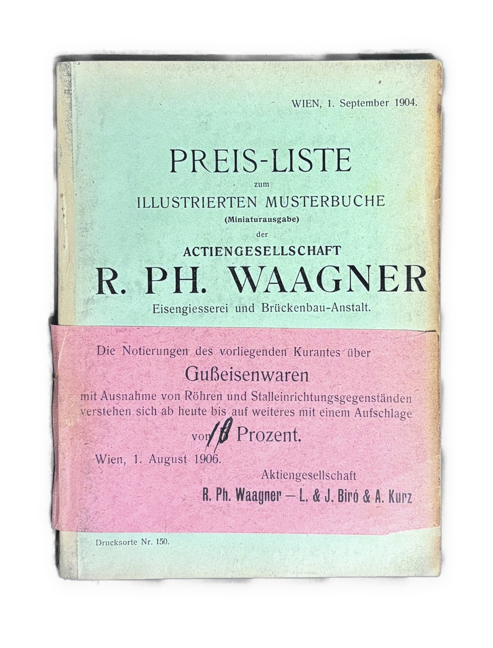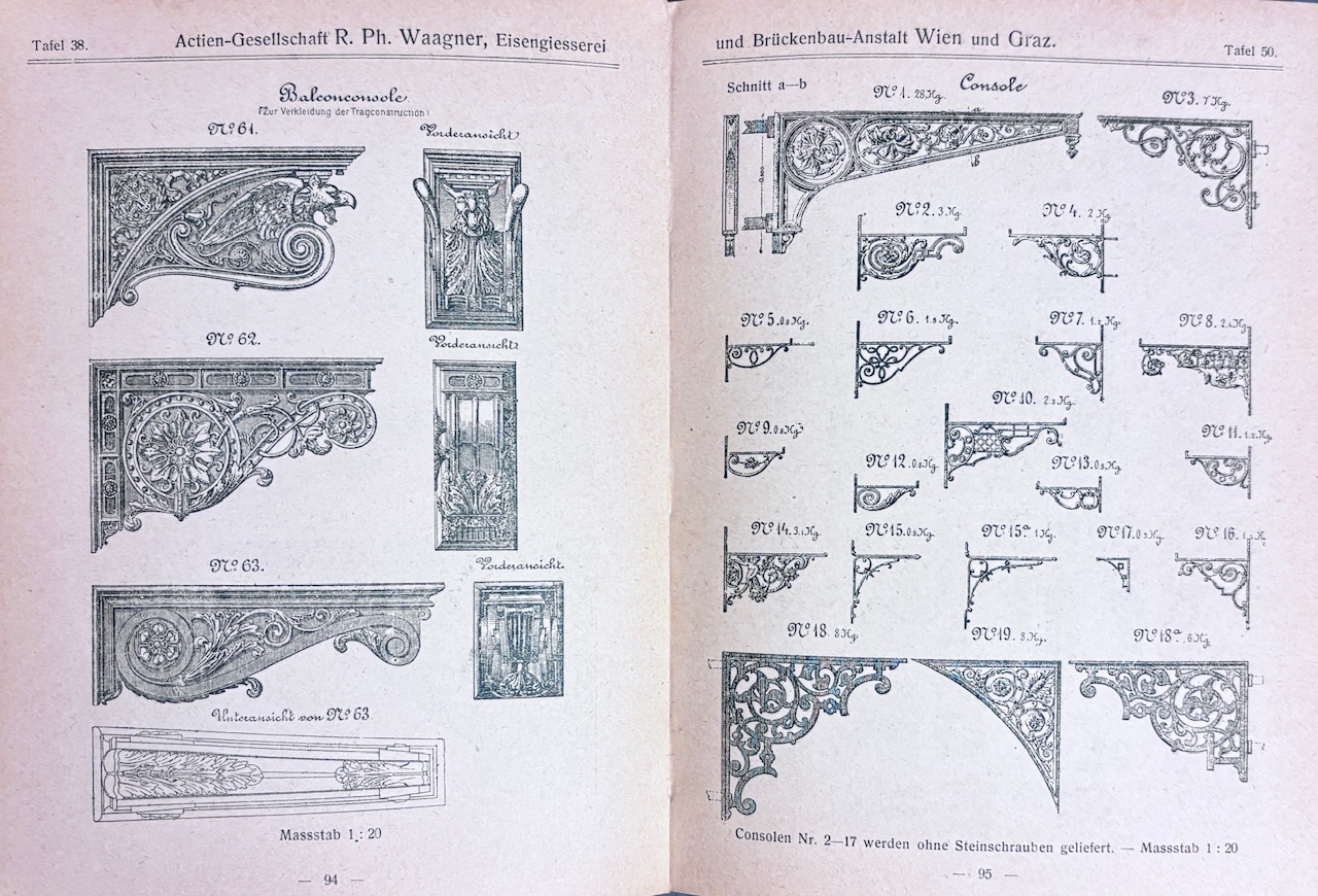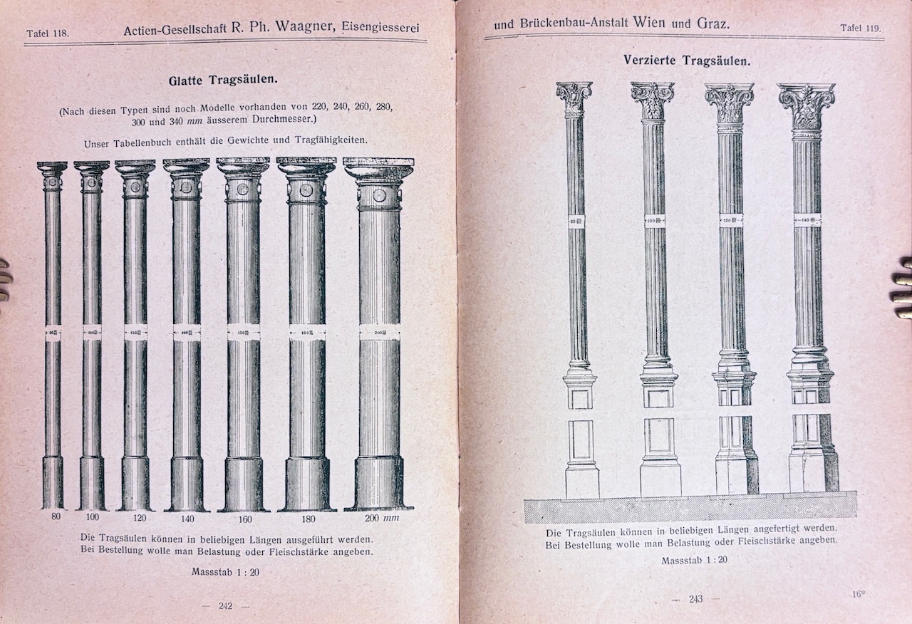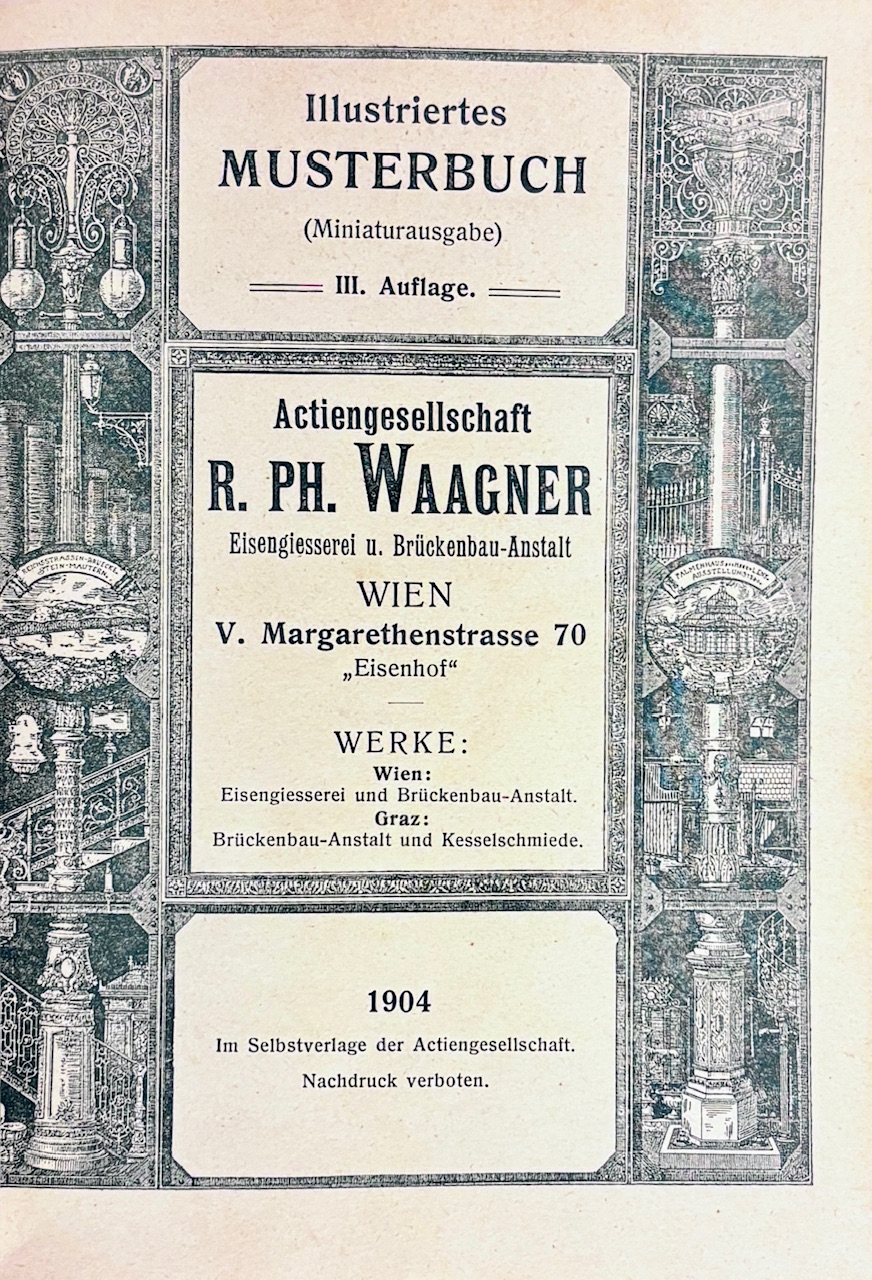 Katalóg jednej z najvýznamnejších rakúskych strojárskych a mostárskych spoločností prelomu 19. a 20. storočia – R. Ph. Waagner A.G., známej realizáciou mnohých železných konštrukcií (vrátane spolupráce s firmou L. & J. Bíró & A. Kurz). Publikácia slúžila ako vzorkovnica produktov z liatiny, kovu a ocele – používaná architektmi, staviteľmi a priemyselnými zákazníkmi. Miniatúrne vydanie bolo určené pre obchodných zástupcov a obsahuje aj samostatný cenník, ktorý dokumentuje dobové ceny a technické sortimenty firmy v roku 1904–1906.- Katalóg nabitý obrázkami technických vzoriek produktov firmy – dekoratívne liatinové prvky, konštrukcie, stĺpy, zábradlia a mostné komponenty, dokumentuje priemyselný a technický dizajn monarchie.- 3. vydanie.- Originálna plátená väzba. Hrany len jemne ošúchané, drobné tmavé fliačky, inak dobrý stav