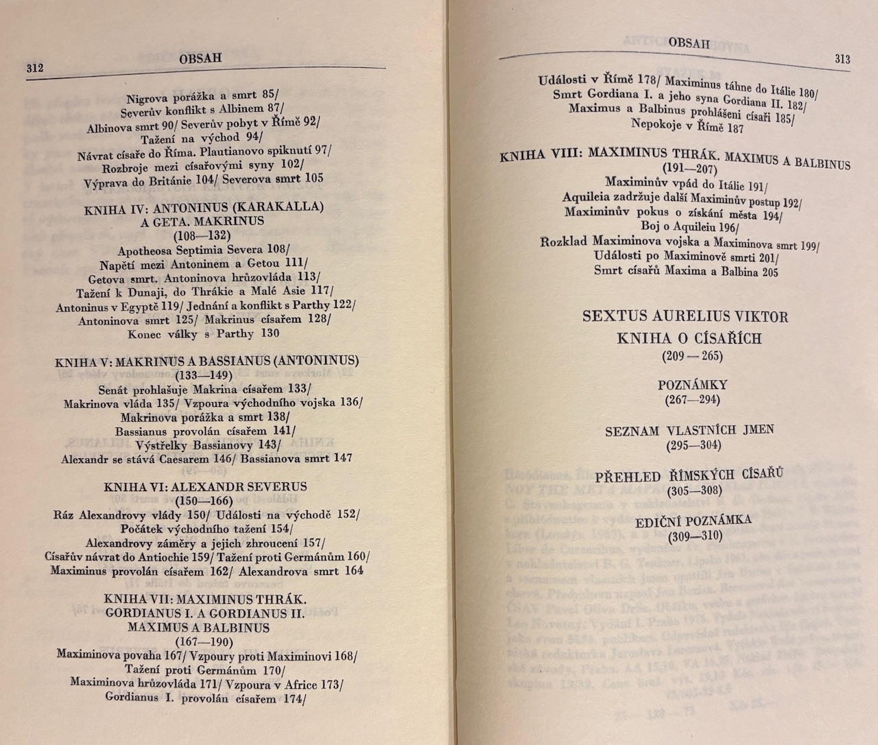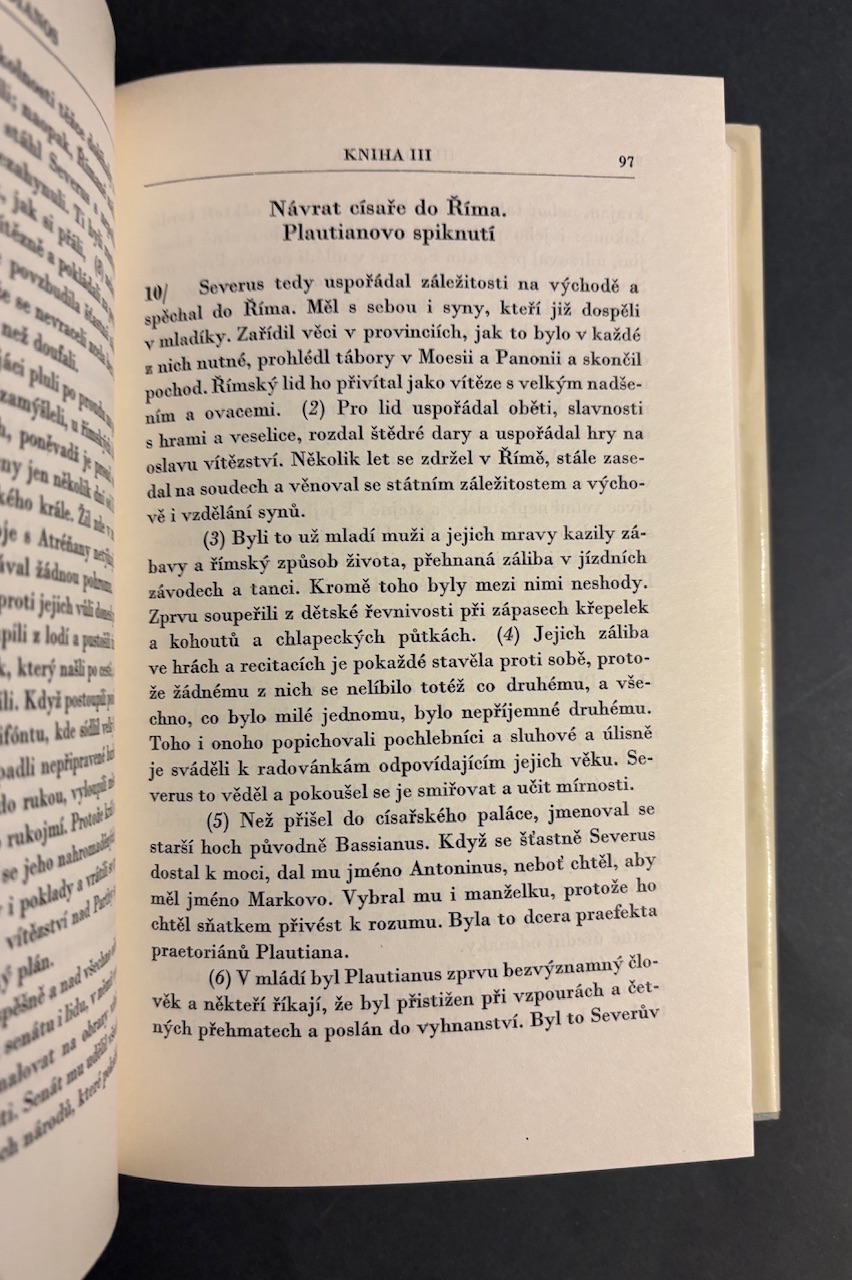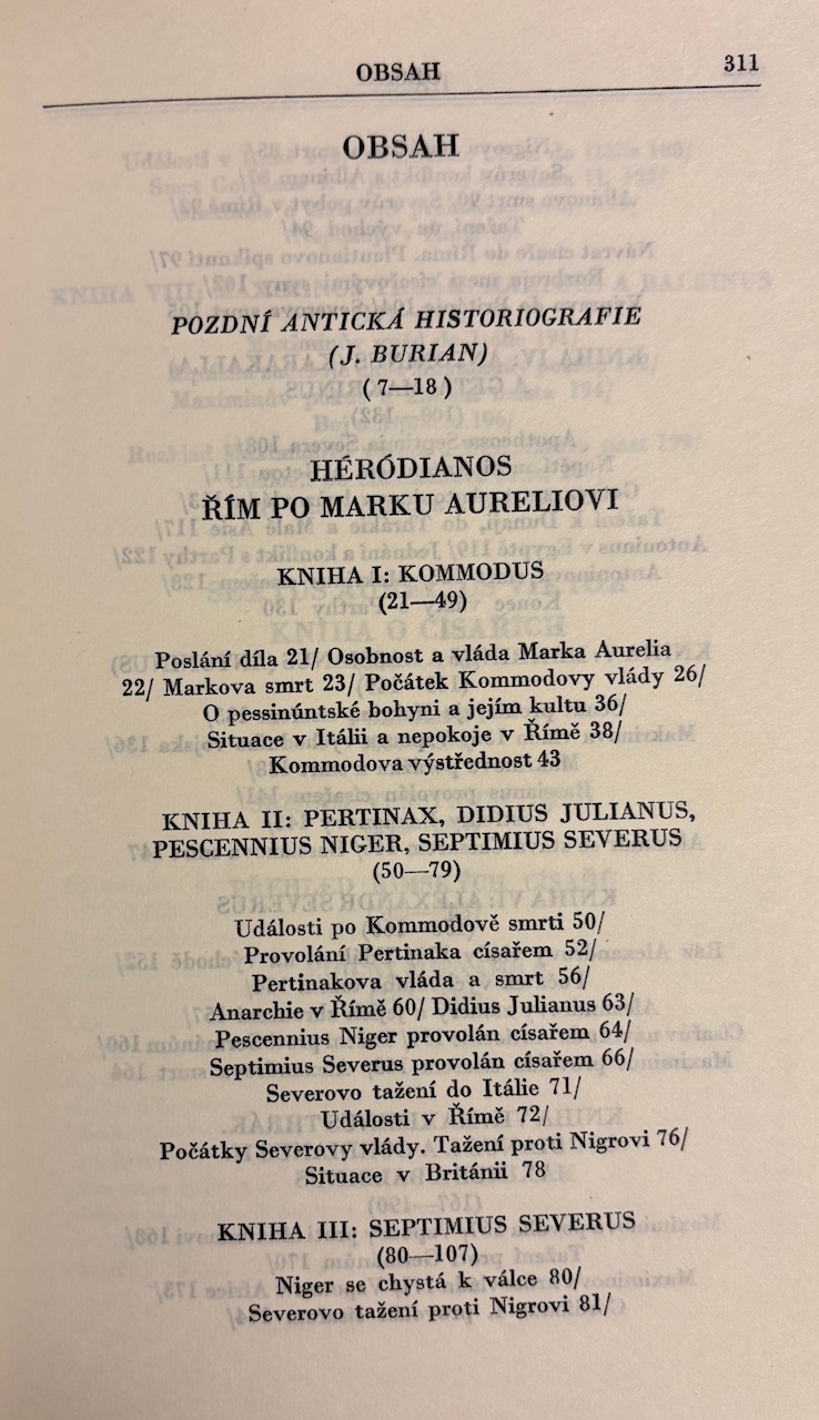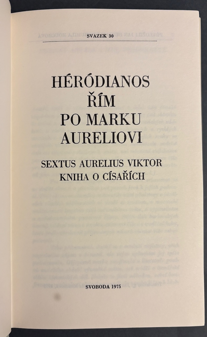 Dvojica významných historických prameňov približujúcich turbulentné obdobie Rímskej ríše po smrti Marka Aurelia – čas, keď sa stabilita impéria rozpadá pod tlakom vojenských vzbúr, politických intríg a rýchlo sa striedajúcich cisárov. Héródianos podáva živé, dramatické rozprávanie očitého svedka udalostí 2. a 3. storočia. Jeho text pôsobí miestami až románovo – plný prevratov, bojov o moc a psychológie vládcov. Zväzok dopĺňa Kniha o císařích od Sexta Aurelia Viktora – stručný, prehľadný súhrn portrétov rímskych panovníkov, ktorý dnes slúži ako cenná orientačná kronika dejín impéria. Spolu vytvárajú kompaktný obraz úpadku cisárskeho Ríma z pohľadu samotných antických autorov – nie neskorších historikov.