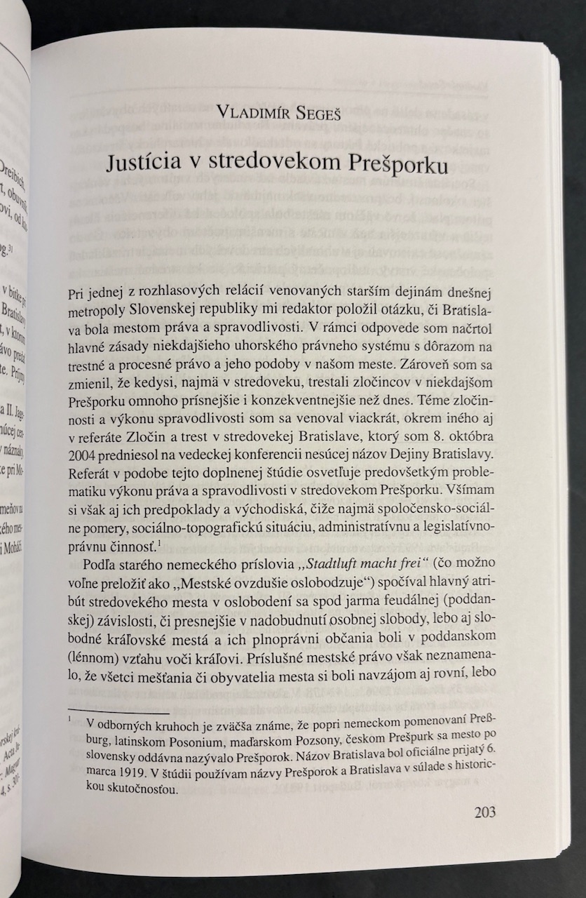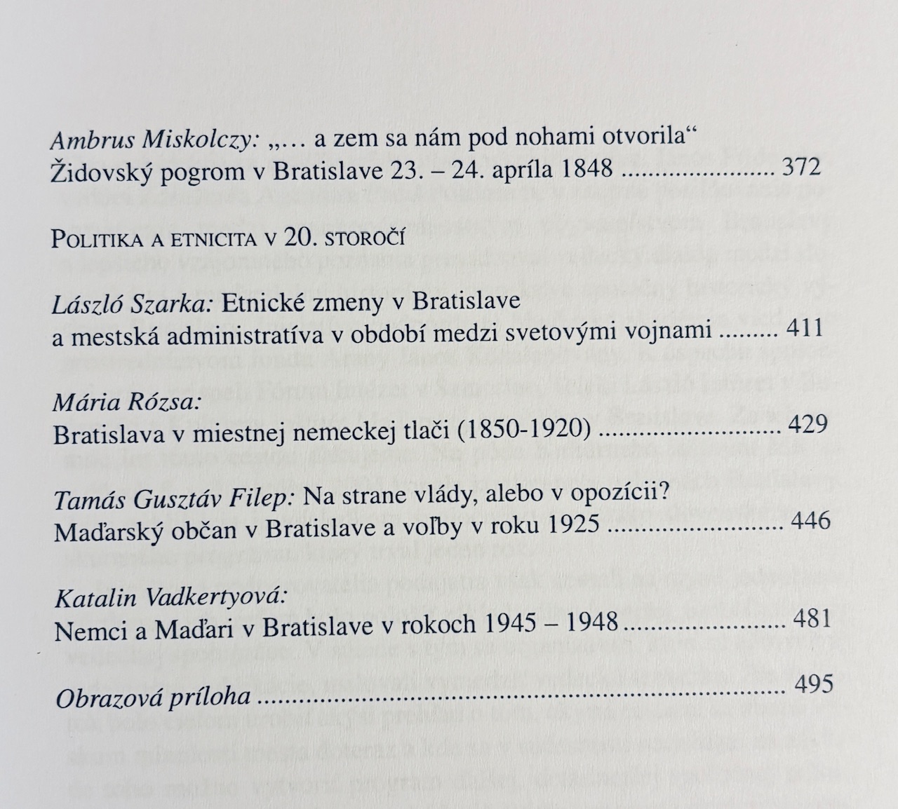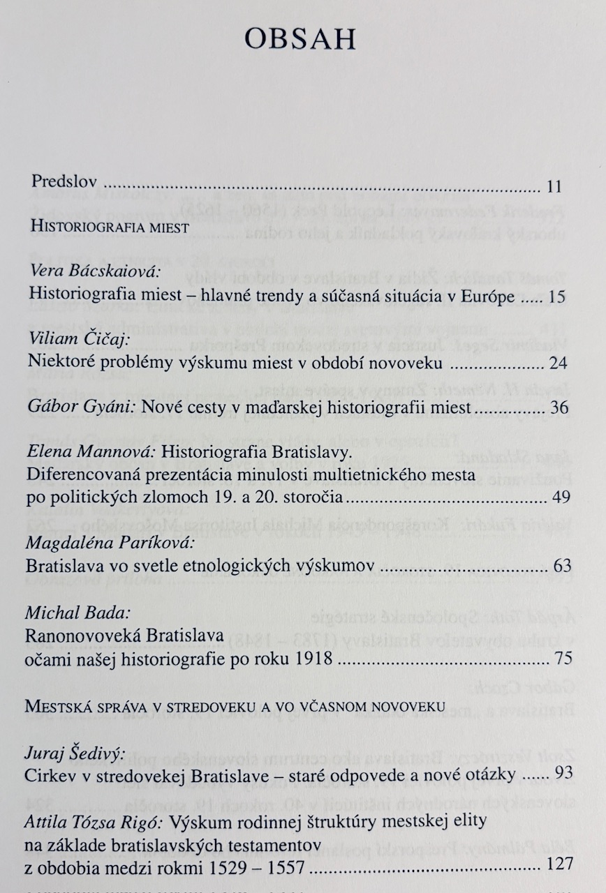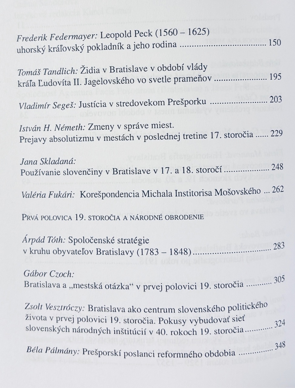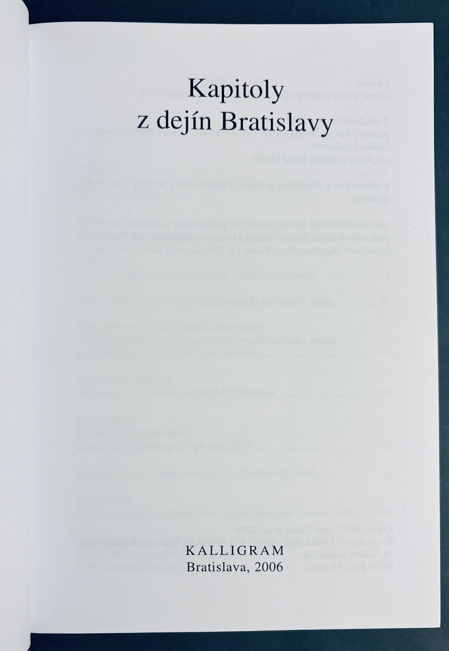 Súbor odborných štúdií zameraných na dejiny Bratislavy od stredoveku až po 20. storočie, pričom osobitnú pozornosť venuje historiografii mesta, jeho sociálnej štruktúre, správe, etnickým vzťahom a politickému vývoju. Časť venovaná historiografii miest sa zaoberá vývojom výskumu mestských dejín v Európe a interpretáciou minulosti Bratislavy v kontexte jej multietnického charakteru. Kapitoly o stredoveku a ranom novoveku analyzujú mestskú správu, cirkevné pomery, justíciu, sociálnu štruktúru mestskej elity a každodenné fungovanie mesta na základe písomných prameňov. Štúdie zamerané na 17. a 18. storočie sledujú jazykové pomery, absolutistické zásahy do správy miest a kultúrno-spoločenský vývoj Bratislavy. Blok venovaný prvej polovici 19. storočia skúma spoločenské stratégie obyvateľov, národné obrodenie a formovanie politického a kultúrneho významu mesta. Samostatné kapitoly sa venujú etnickým a náboženským vzťahom, najmä židovskej komunite, vrátane konfliktov a násilností v revolučnom roku 1848. Záverečná časť sa sústreďuje na 20. storočie, etnické zmeny, politiku, voľby, médiá a povojnové pomery v Bratislave.- 8-stranová obrazová príloha.- Dobrý stav