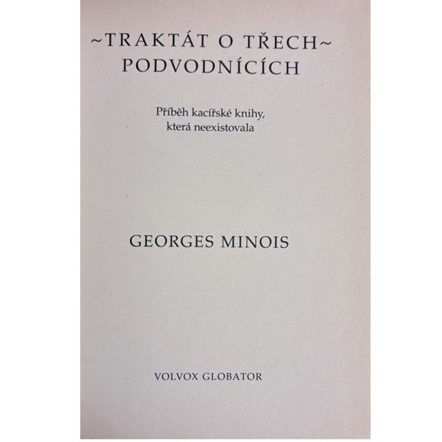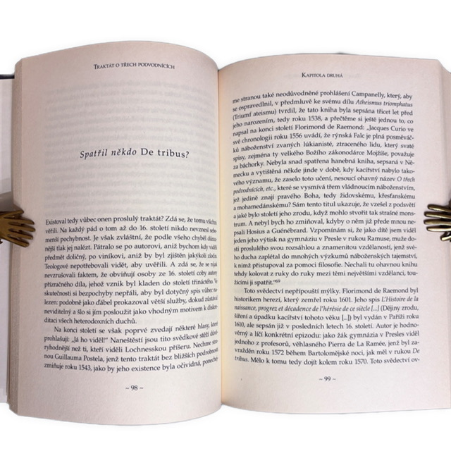 Autor v tejto mimoriadne čítavej práci rekonštruuje skutočný príbeh tejto „knihy, ktorá neexistovala“. Sleduje jej stopu od stredovekých obvinení a inkvizičných strachov, cez renesančné klebety a osvietenské polemiky, až po moment, keď sa na začiatku 18. storočia text skutočne objaví – pravdepodobne ako vedomá mystifikácia, ktorá využila silu vlastného mýtu.