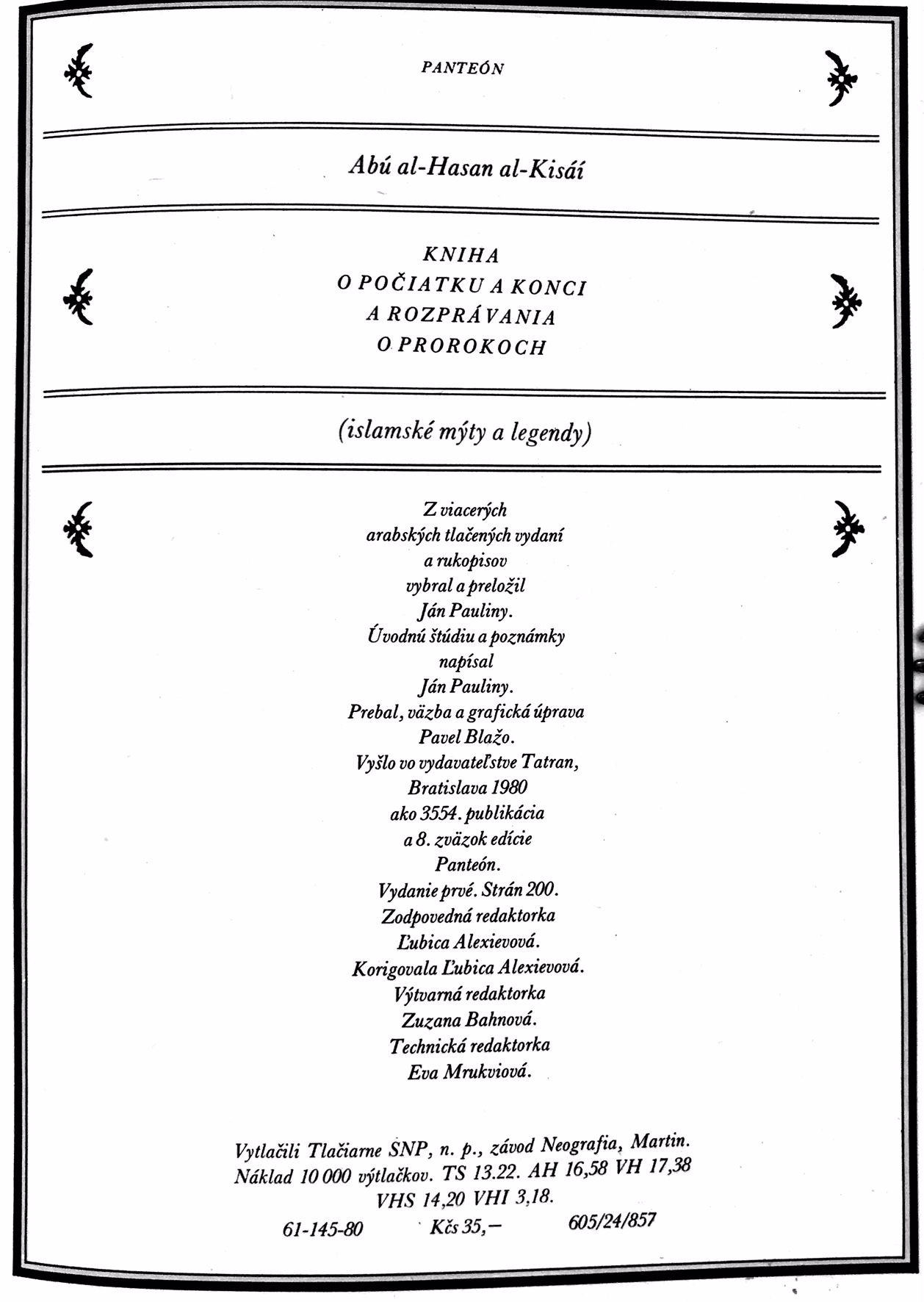 Abú al-Hasan al-Kisáí Kniha o počiatku a konci a Rozprávania o prorokoch (I... 13,00 € Bratislava, 1980 Vydavateľstvo Tatran Beletria Kniha o počiatku a konci a Rozprávania o prorokoch (Islamské mýty a legendy)