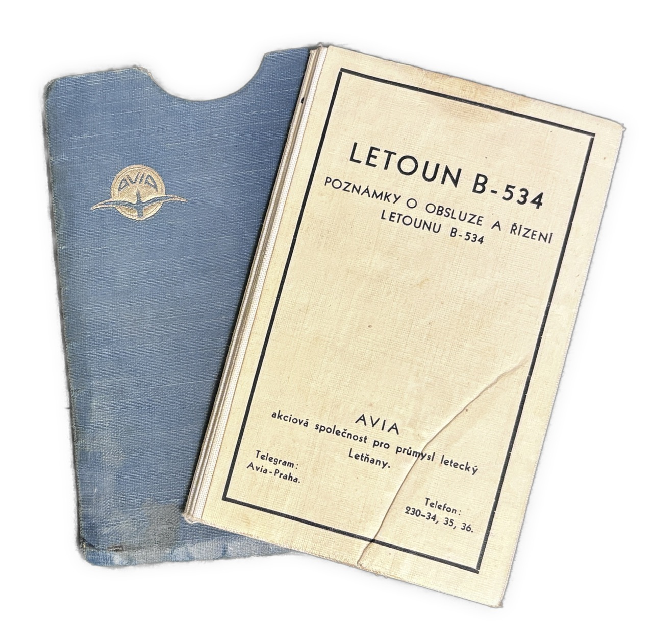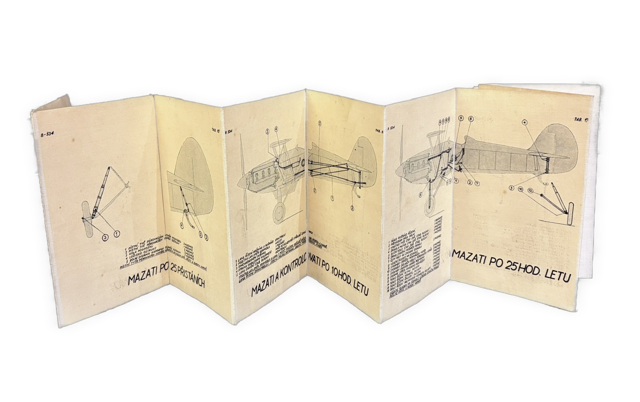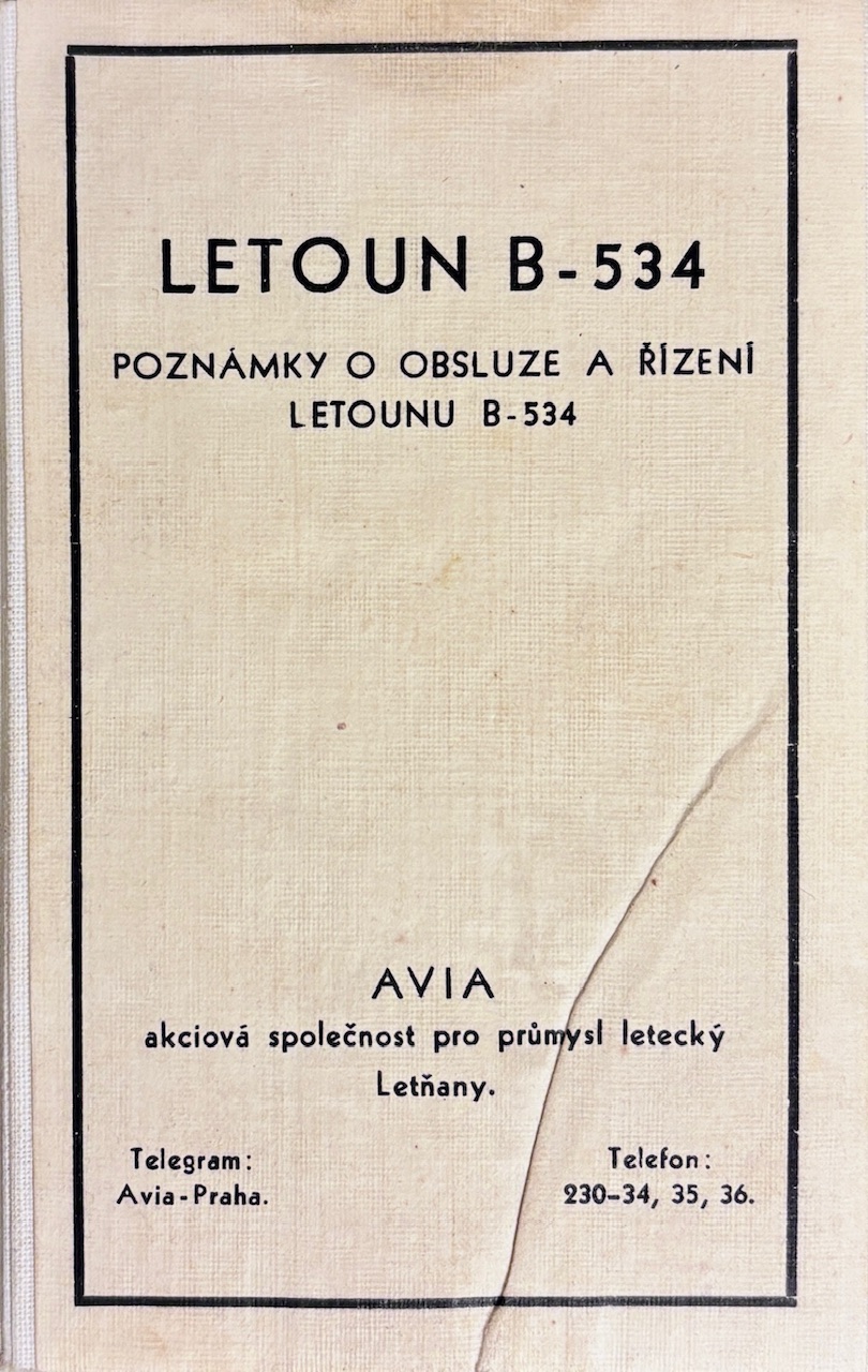 Poznámky o obsluze a řízení letounu B-534.- Prototyp z roku 1933, výroba 1935-39.- leporelová skladačka na jednej strane textová časť a na druhej nákresová.- Podlepené plátnom a vložené do orig. pláteného obalu, po hranách ošúchaný