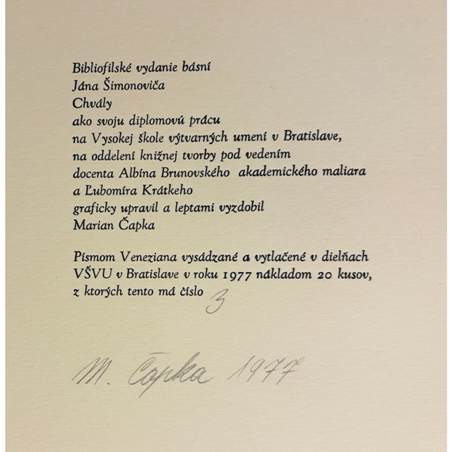 Vytlačené v dielňach VŠVU v mimoriadne malom náklade iba 20 kusov. Ponúkaný exemplár je číslovaný ako č. 3.- Obal sčasti zatečený, konce chrbátika jemne opravované