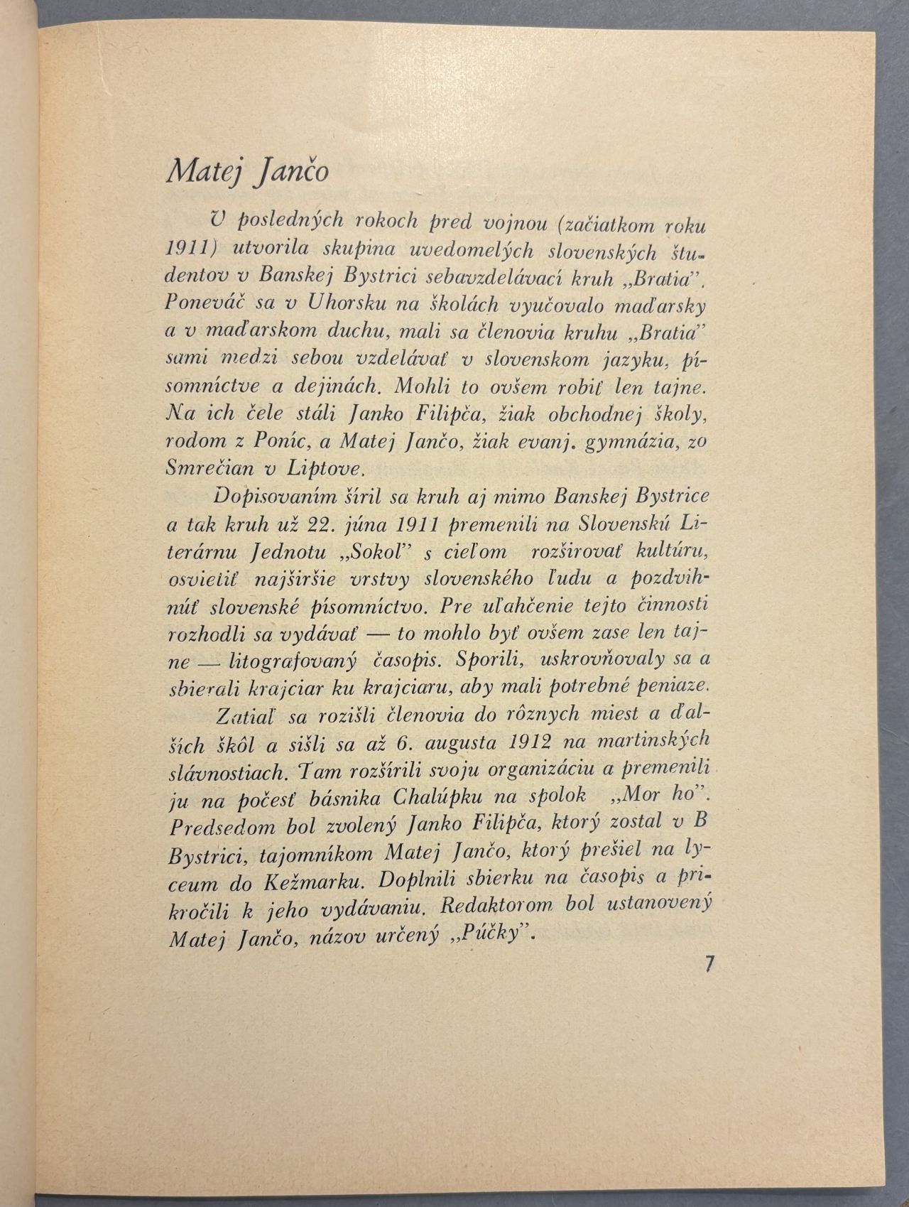 Matej Jančo pôsobil ako spoluorganizátor národných spolkov Bratia a Sokol. V rokoch 1911 – 1912. od 1912 bol tiež tajomníkom tajného študentského spolku Mor ho!, ktorý presadzoval výchovu slovenskej mládeže v národnom duchu, písal básne s národným zameraním. Za svoju buditeľskú činnosť bol odsúdený a vylúčený zo všetkých škôl v Uhorsku.- Predhovor Metod Bella.- Pekný stav