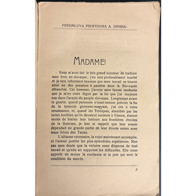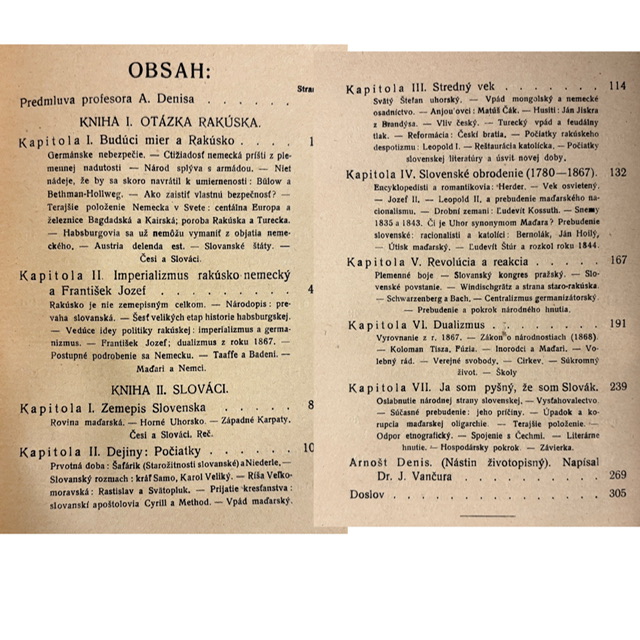 ZAUJÍMAVOSŤ: Arnošt Denis (Ernest Denis), profesor na Sorbonne, bol jedným z najvýraznejších francúzskych intelektuálov podporujúcich vznik Československa. Jeho texty boli čítané nielen ako akademické práce, ale aj ako politické argumenty v prospech samostatnosti českého a slovenského národa. Slovenské vydanie z roku 1922 patrí k raným dokumentom, ktoré formovali verejnú diskusiu o postavení Slovákov v novom štáte. Ide teda o dobový hlas z bezprostredného obdobia po roku 1918.