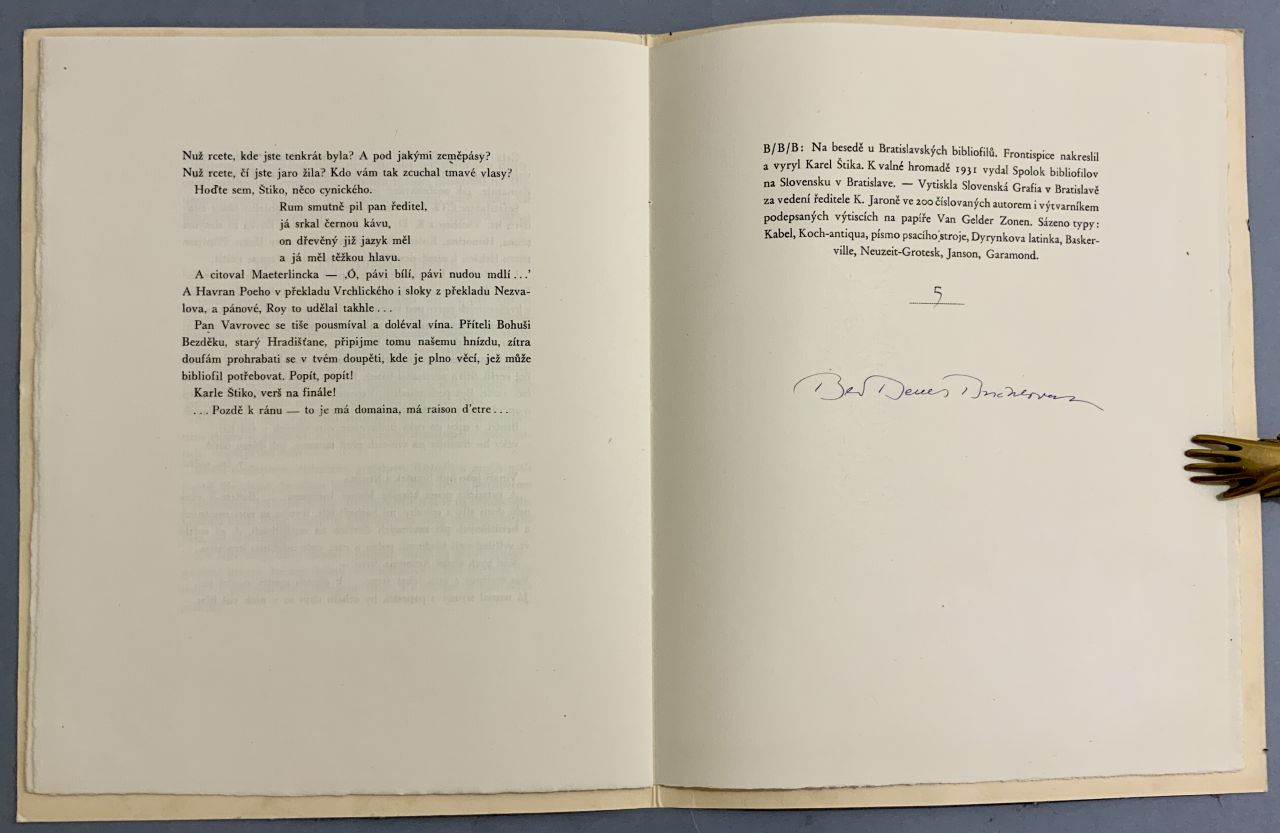 K valnej hromade Spolku bibliofilov v roku 1931. Tlačou Slovenskej grafie (K. Jaroň). Vyšlo 200 exemplárov číslovaných a podpísaných, tento exemplár má č. 5 s vlastnoručným podpisom autora. Na frontispice pôvodný signovaný dvojfarebný drevoryt Karla Štiku.- Pekný stav