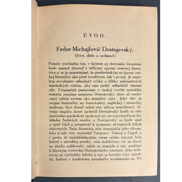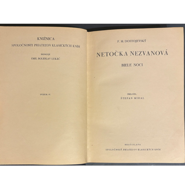Medzivojnové vydanie dvoch kratších próz veľkého ruského klasika. Netočka Nezvanová je citlivým príbehom dospievania a hľadania identity, zatiaľ čo Biele noci – označované autorom ako sentimentálny román – patria k jeho najnežnejším a najčitateľnejším textom o samote, láske a ilúzii mestských nocí. Zväzok vyšiel v reprezentatívnej edícii Spoločnosti priateľov klasických kníh, ktorá sa vyznačovala kvalitnou typografiou a dekoratívnou plátenou väzbou so zlatou razbou. Súčasťou knihy je aj rozsiahla úvodná literárno-kritická štúdia Milana Pišúta, približujúca život a dielo autora – dnes cenný dobový dokument recepcie Dostojevského na Slovensku.- Odporúčame pre čitateľa, ktorý má rád psychologickú prózu, chápe jemné odtiene medzi nevinnosťou a zranením a ocení aj dobový literárnovedný kontext
