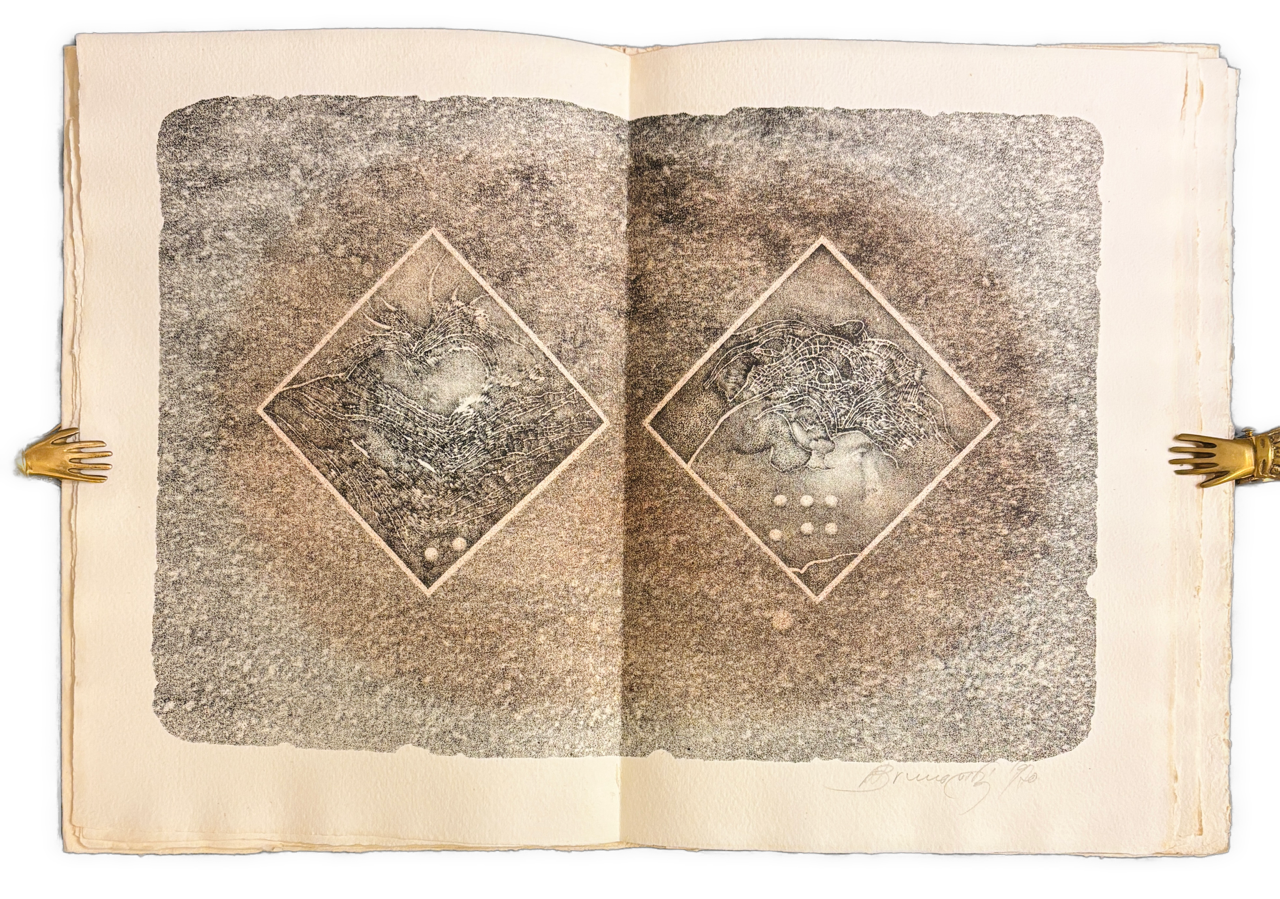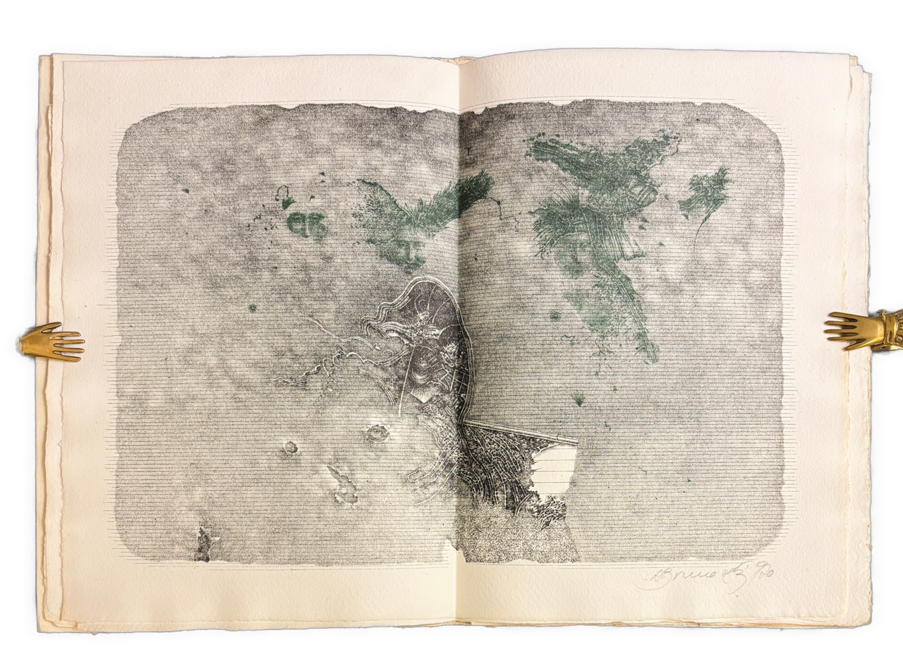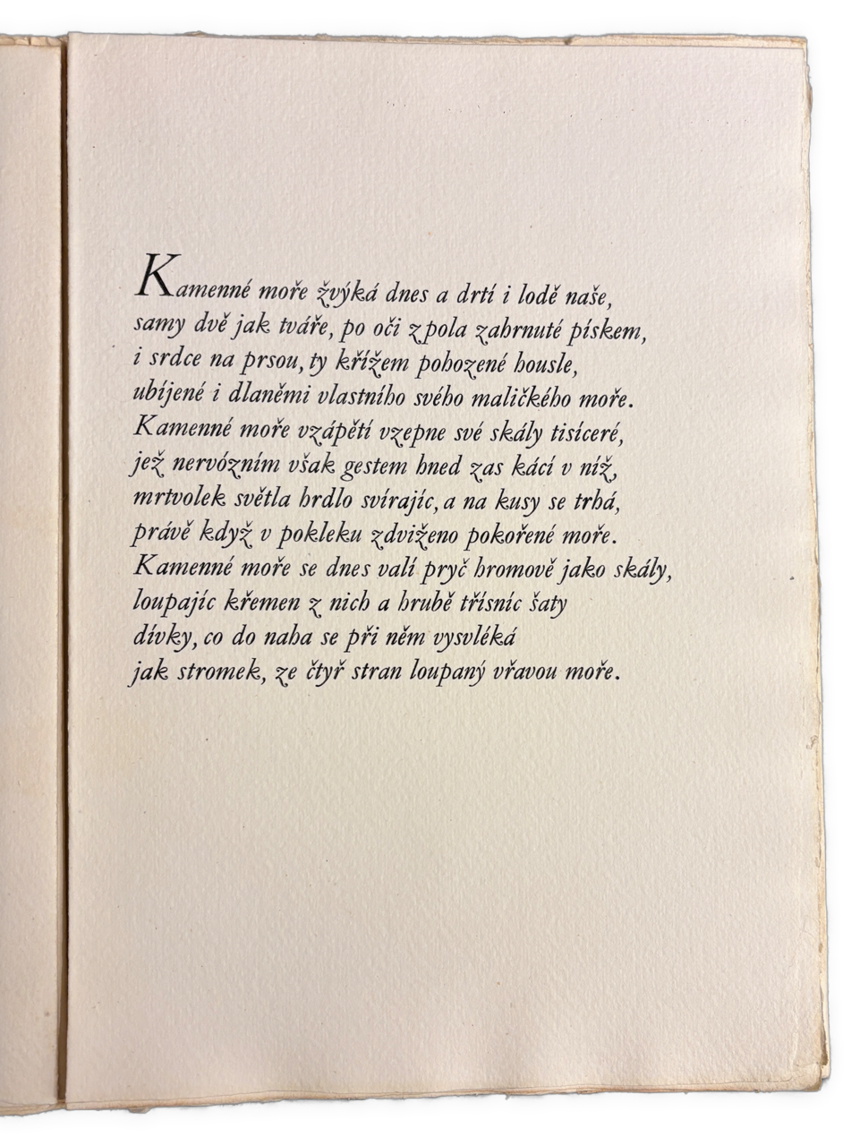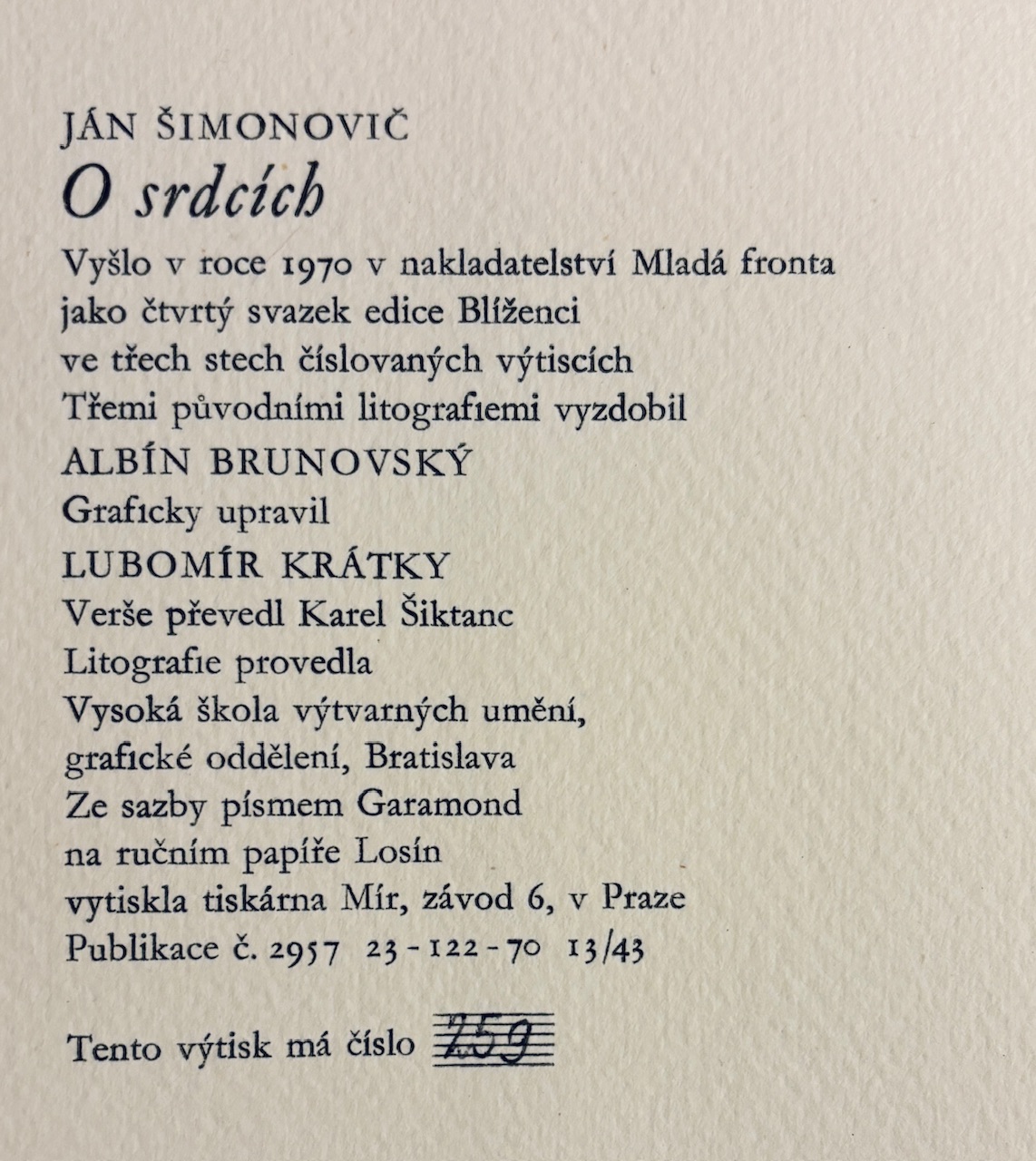 Bibliofilské vydanie básnickej zbierky vyšlo v limitovanom náklade 300 ručne číslovaných exemplárov ako 4. zväzok edície Blíženci nakladateľstva Mladá fronta. Preklad veršoc Karel Šiktanc.- Knihu výtvarne vyzdobil Albín Brunovský tromi pôvodnými signovanými dvojstránkovými litografiami (24x35,5 cm, v strede preložené) vytlačenými na Vysokej škole výtvarných umení v Bratislave.- Tlačené na luxusnom ručnom papieri Losín, viazané voľne v obálke. Toto vydanie patrí medzi najvyhľadávanejšie bibliofilské spolupráce slovenského básnika a grafika A. Brunovského.- Voľné archy sú vložené v papierovej obálke zdobenej slepotlačou. Papierová obálka len minimálne zaprášená, v dolnom ľavom rohu nepratrne zvlnená, prvá strana predsádky s mini fliačikom. V pôvodnom kartónovom obalena hranách a rohoch poškodený