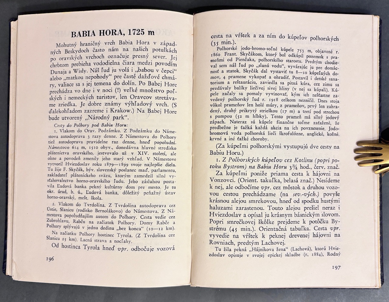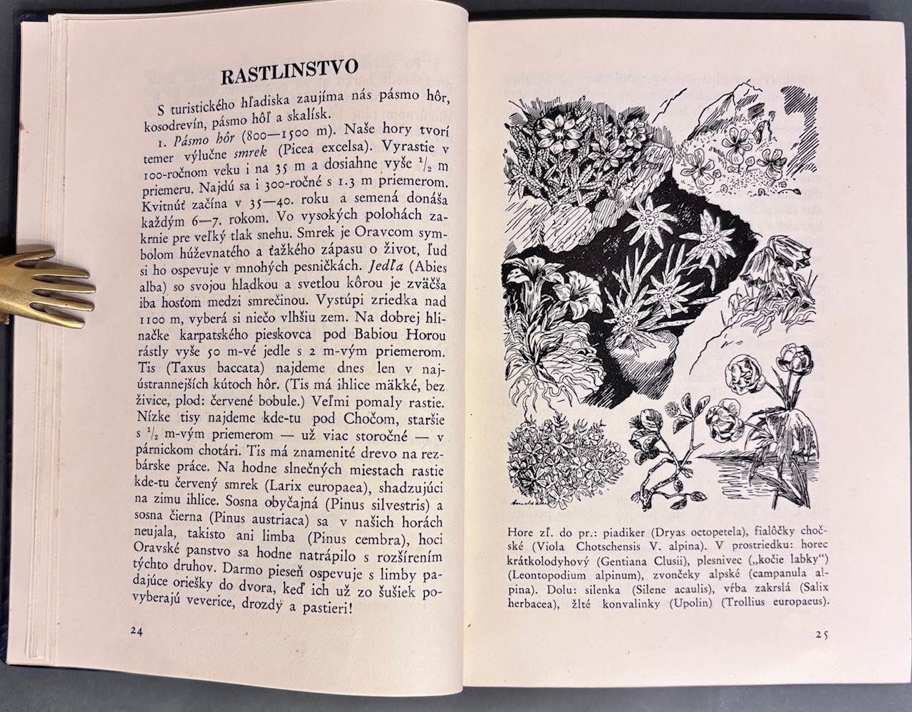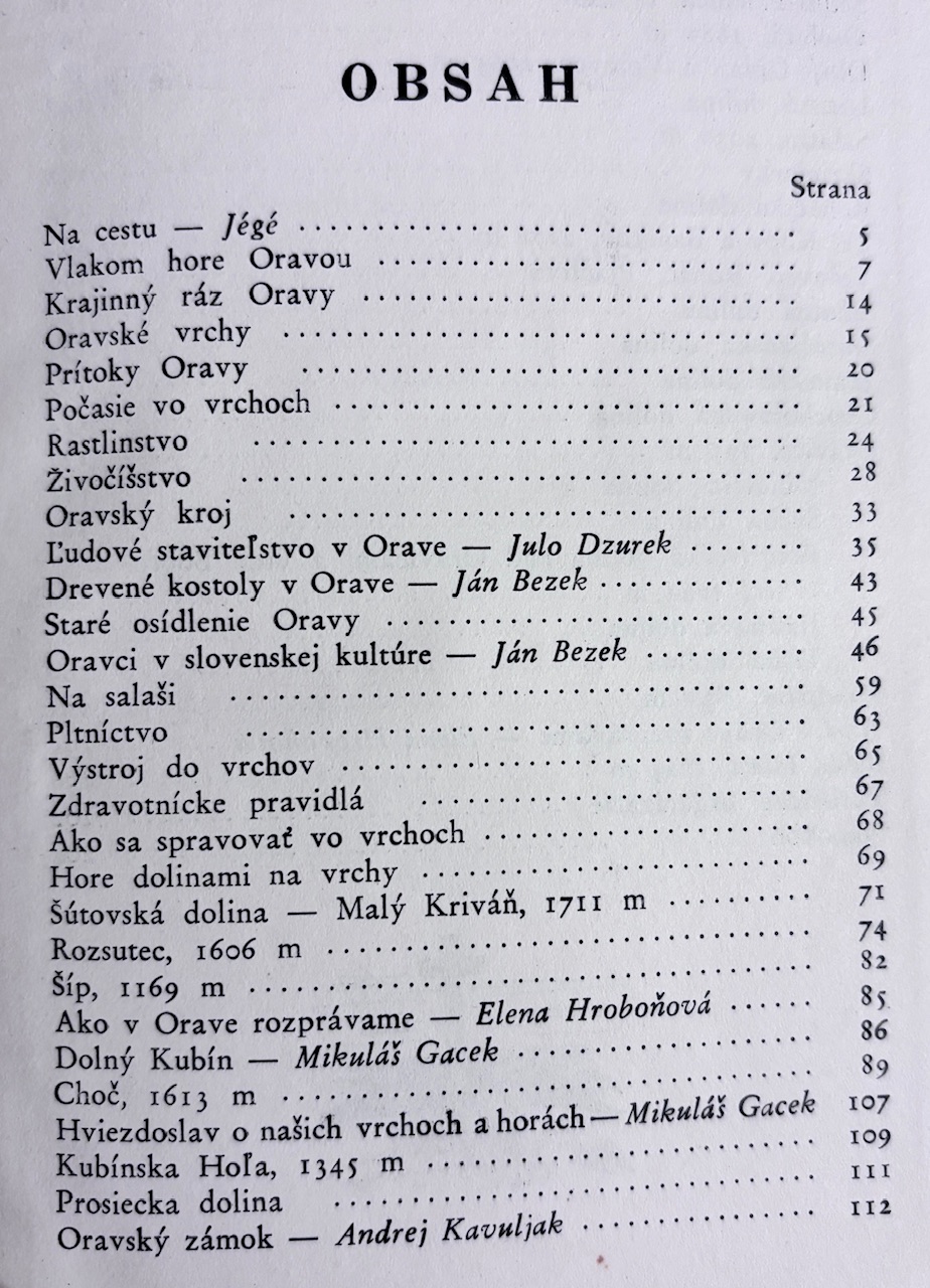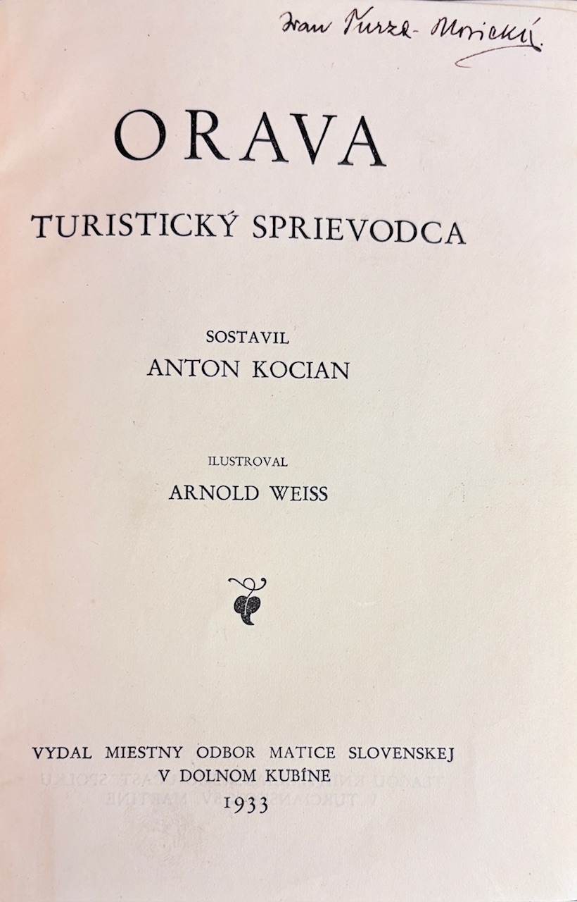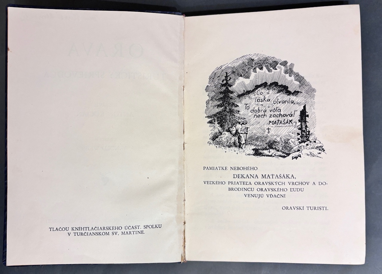 Pamiatke nebohého dekana Maťašáka, veľkého priateľa oravských vrchov a dobrodincu oravského ľudu venujú vďační oravskí turisti.- Bohato ilustrované čiernobielymi kresbami Arnolda Weissa.- Na titulnom liste podpis pôvodného majiteľa.- Pekná preväzba.- Predná doska sa za titulným listom len minimálne uvoľnená, inak pekný stav
