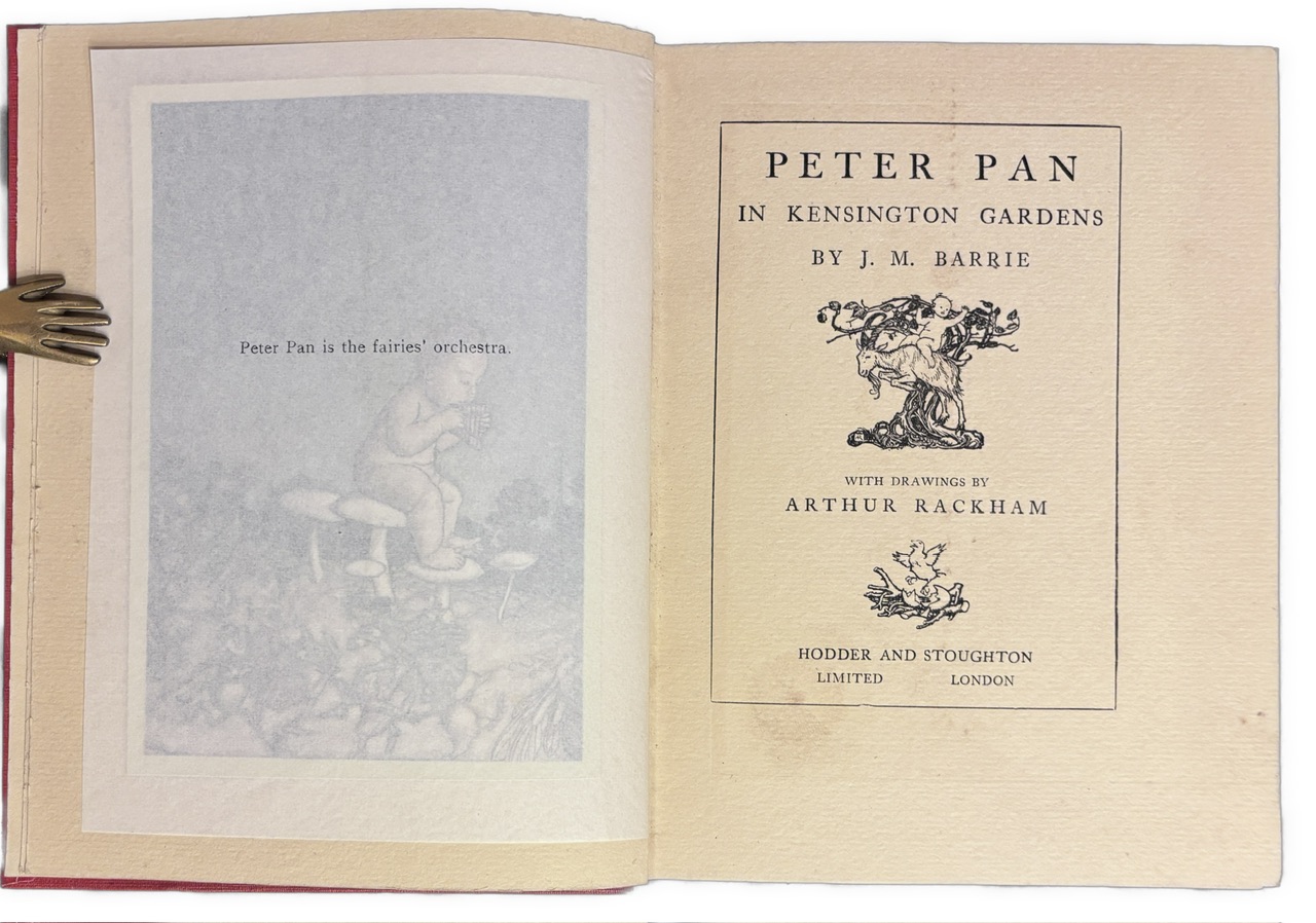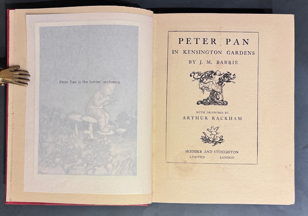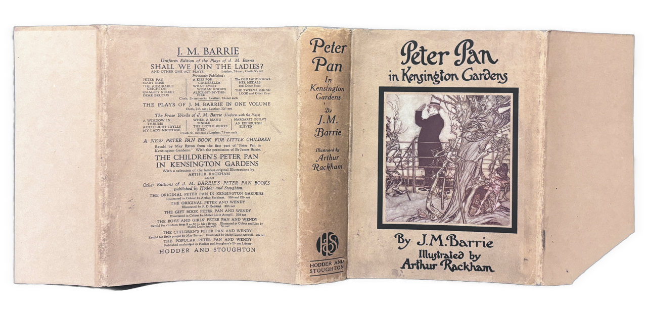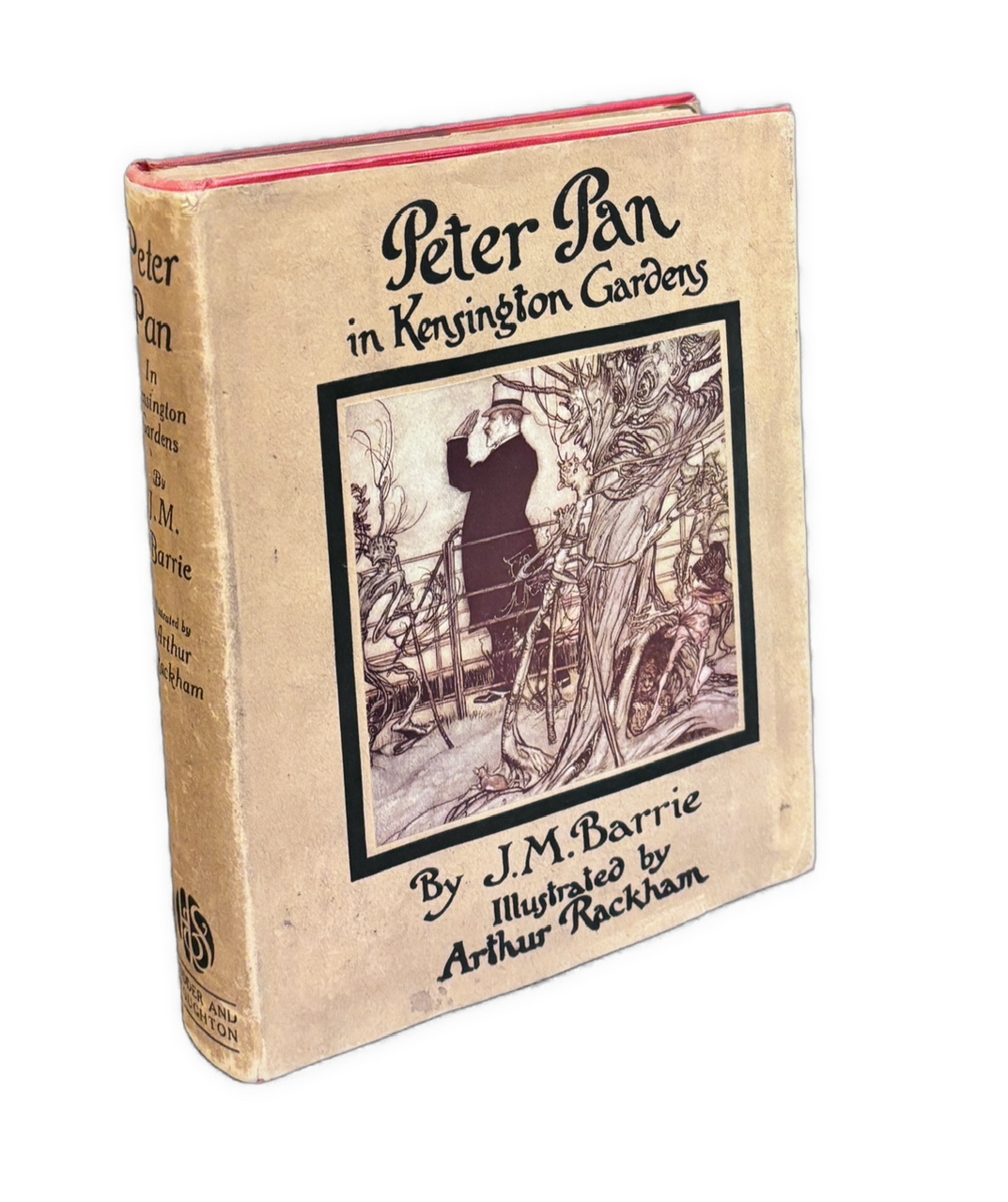Vydanie epizódy o Peterovi Panovi, pôvodne obsiahnutej v Barrieho knihe The Little White Bird (1902), pochádza z populárnej skrátenej edície vydávanej vydavateľstvom Hodder & Stoughton v 20. rokoch 20. storočia, ktorá obsahovala 16 vybraných ilustrácií Arthura Rackhama. Ilustrácie Arthura Rackhama patria medzi vrcholy britskej knižnej ilustrácie začiatku 20. storočia a zásadne ovplyvnili ikonografiu postavy Petra Pana. Vydanie Hodder & Stoughton z roku 1906 je považované za jedno z najkrajších ilustrovaných diel edvardiánskej éry. 16 farebných ILU (tipped-in) s ochrannými papiermi, všetky od Arthura Rackhama.- Pôvodná dekorovaná červená plátená väzba so zlatou razbou (motív chlapca sediaceho na hube), zdobený rám po okrajoch; pôvodný, vzácne zachovalý papierový prebal s ilustráciou Arthura Rackhama (predný dolný roh papierovej obálky odstrihnutý, prebal len mierne opravovaný, zľahka zaprášený)