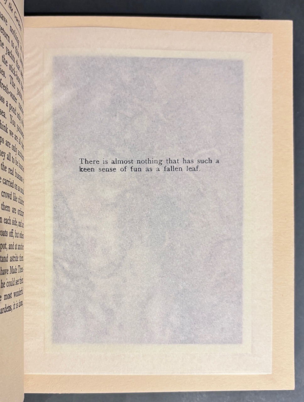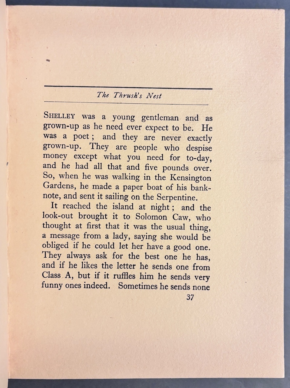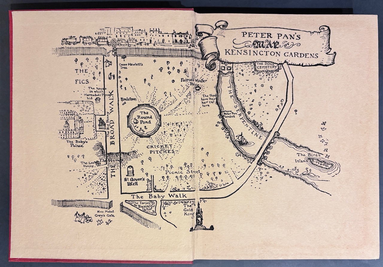 Vydanie epizódy o Peterovi Panovi, pôvodne obsiahnutej v Barrieho knihe The Little White Bird (1902), pochádza z populárnej skrátenej edície vydávanej vydavateľstvom Hodder & Stoughton v 20. rokoch 20. storočia, ktorá obsahovala 16 vybraných ilustrácií Arthura Rackhama. Ilustrácie Arthura Rackhama patria medzi vrcholy britskej knižnej ilustrácie začiatku 20. storočia a zásadne ovplyvnili ikonografiu postavy Petra Pana. Vydanie Hodder & Stoughton z roku 1906 je považované za jedno z najkrajších ilustrovaných diel edvardiánskej éry. 16 farebných ILU (tipped-in) s ochrannými papiermi, všetky od Arthura Rackhama.- Pôvodná dekorovaná červená plátená väzba so zlatou razbou (motív chlapca sediaceho na hube), zdobený rám po okrajoch; pôvodný, vzácne zachovalý papierový prebal s ilustráciou Arthura Rackhama (predný dolný roh papierovej obálky odstrihnutý, prebal len mierne opravovaný, zľahka zaprášený)