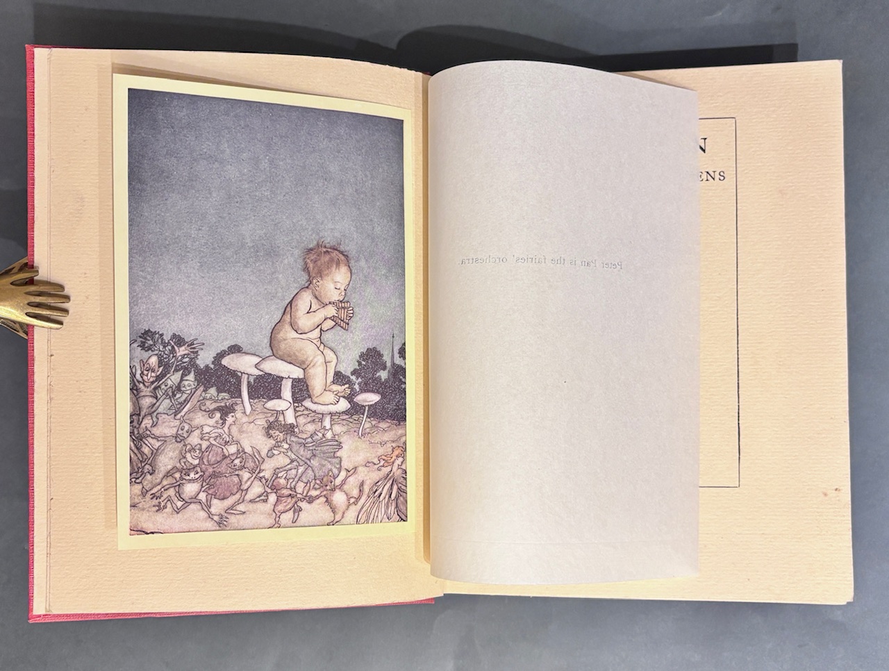 The edition of the episode about Peter Pan, originally included in Barrie’s The Little White Bird (1902), comes from the popular abridged version published by Hodder & Stoughton in the 1920s, featuring sixteen selected illustrations by Arthur Rackham.- Arthur Rackham’s exquisite illustrations represent a landmark in Edwardian book art and have profoundly influenced the visual identity of J. M. Barrie’s beloved character. The 1906 Hodder & Stoughton edition is widely regarded as one of the most beautiful illustrated books of the early 20th century.- 16 tipped-in colour plates with captioned tissue guards, all by Arthur Rackham.- Original decorated red cloth with gilt vignette of a boy sitting on a mushroom, ornamental border on covers; original illustrated dust jacket by Arthur Rackham (lightly restored, the lower front corner of the dust jacket is trimmed, otherwise quite well preserved).- Condition: Very good; edges with minor foxing, sound and complete text block, rare survival of the original dust jacket.