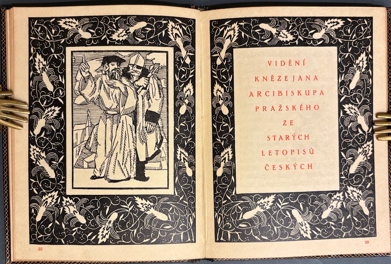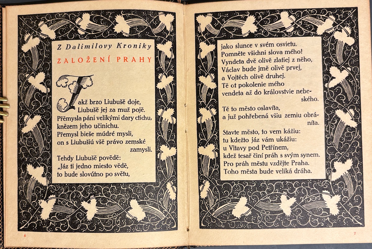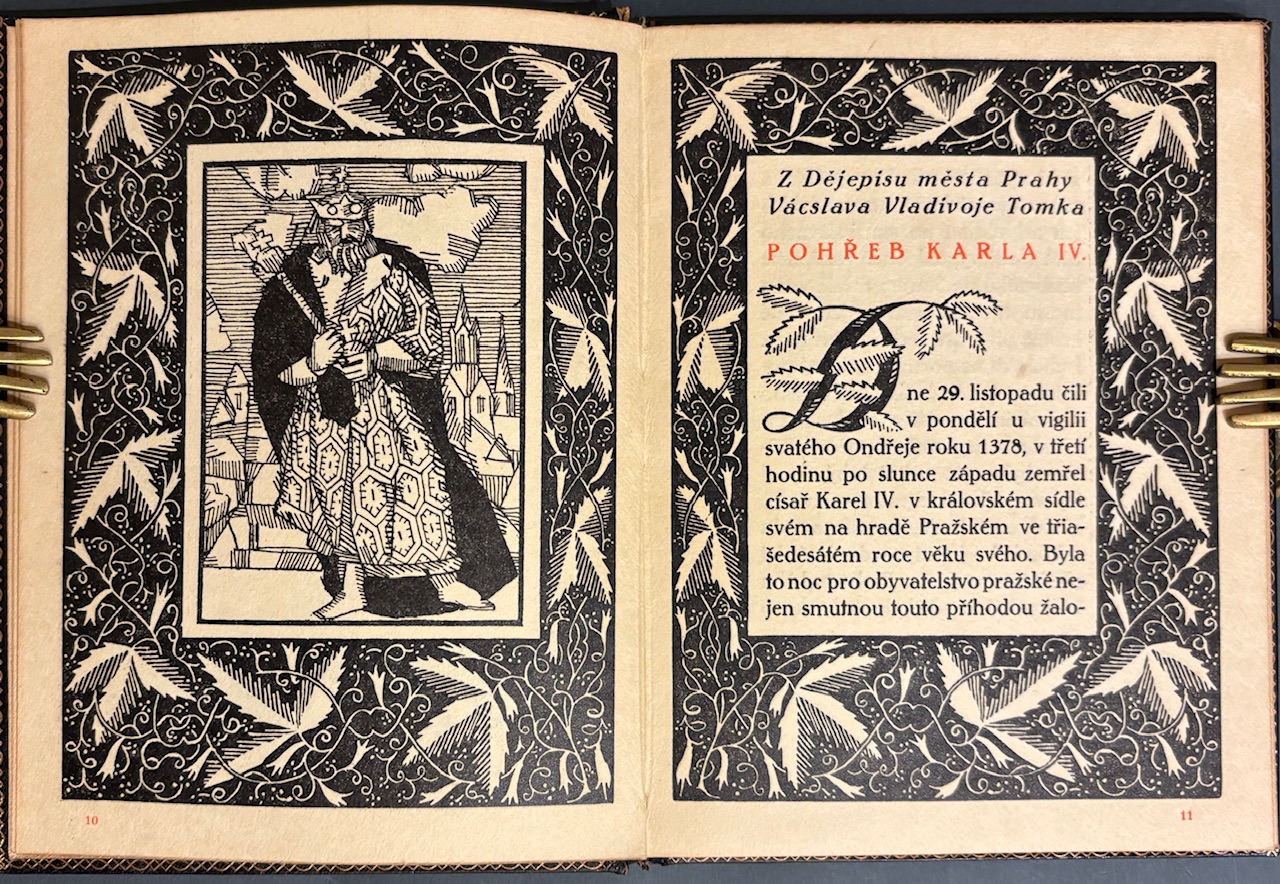Ed. Spolku českých bibliofilú v Praze, kniha 5.- Této knize dostalo se první ceny v soutěži Umělecko-prúmyslového musea Obchodní a živnostenské komory v Praze.- Vybral a upravil František Kysela a V. Vojtíšek.- Celkovo vyšlo 1000 exemplárov, z toho 500 číslovaných a signovaných Fr. Kyselom, náš exemplár má č. 40.- Na predsádke malé ex libris.- Zlatoriezka, na väzbe ozdobný vnútorný okrajový a hranový pásik, tmavomodrá kožená väzba.- Konce chrbáta a dolný roh prednej dosky len minimálne ošúchané, inak výborný stav
