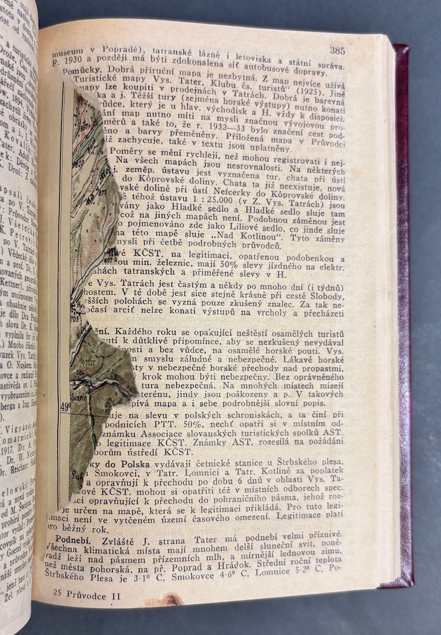 3. prepracované vydanie.- Skladané orientačné plány miest (Bratislava, Trenčianske Teplice a Užhorod), mapka železničnej a autobusovej prepravy, a skladané väčšie mapy (Predné Považie, Horné Považie, Liptovské Hole, Nízke Tatry, Oravsko-Liptovské hory, Vysoké Tatry, Polonina Boržava, Sinovirska Polana - Usťčorna, Svidovec a Čorna Hora).- Mapka medzi 384-385 vytrhnutá.- Nová preväzba, starší podpis na titulnom liste, inak dobrý stav