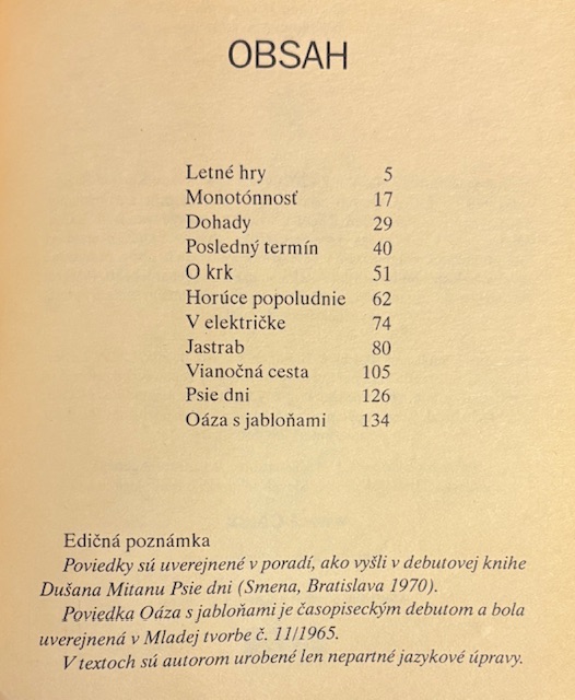 Kniha o období, keď sa život spomaľuje, otázky pribúdajú a človek stojí pred vlastným zrkadlom bez ilúzií, kniha o veľkých pochybnostiach a neviditeľných zápasoch vnútri človeka, jeho neistoty, únavu zo sveta, potrebu lásky, zmyslu a osobnej slobody. Mitana píše úsporne, presne a zároveň hlboko. Ideálna voľba pre čitateľov, ktorí hľadajú intímnu, psychologickú literatúru, pre milovníkov slovenskej klasiky a pre všetkých, ktorí v knihách nehľadajú príbeh, ale porozumenie.- Ed. Hlavolamy, zv. 9.- Obálka Shooty. S pôvodnou záložkou ku knihe.- Malá čiarka na prednej obálke, inak pekný stav