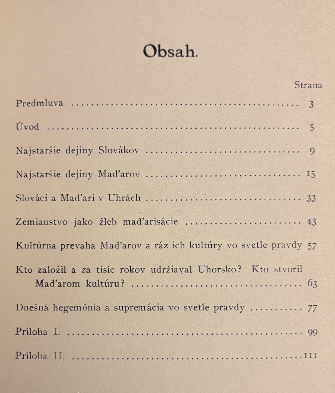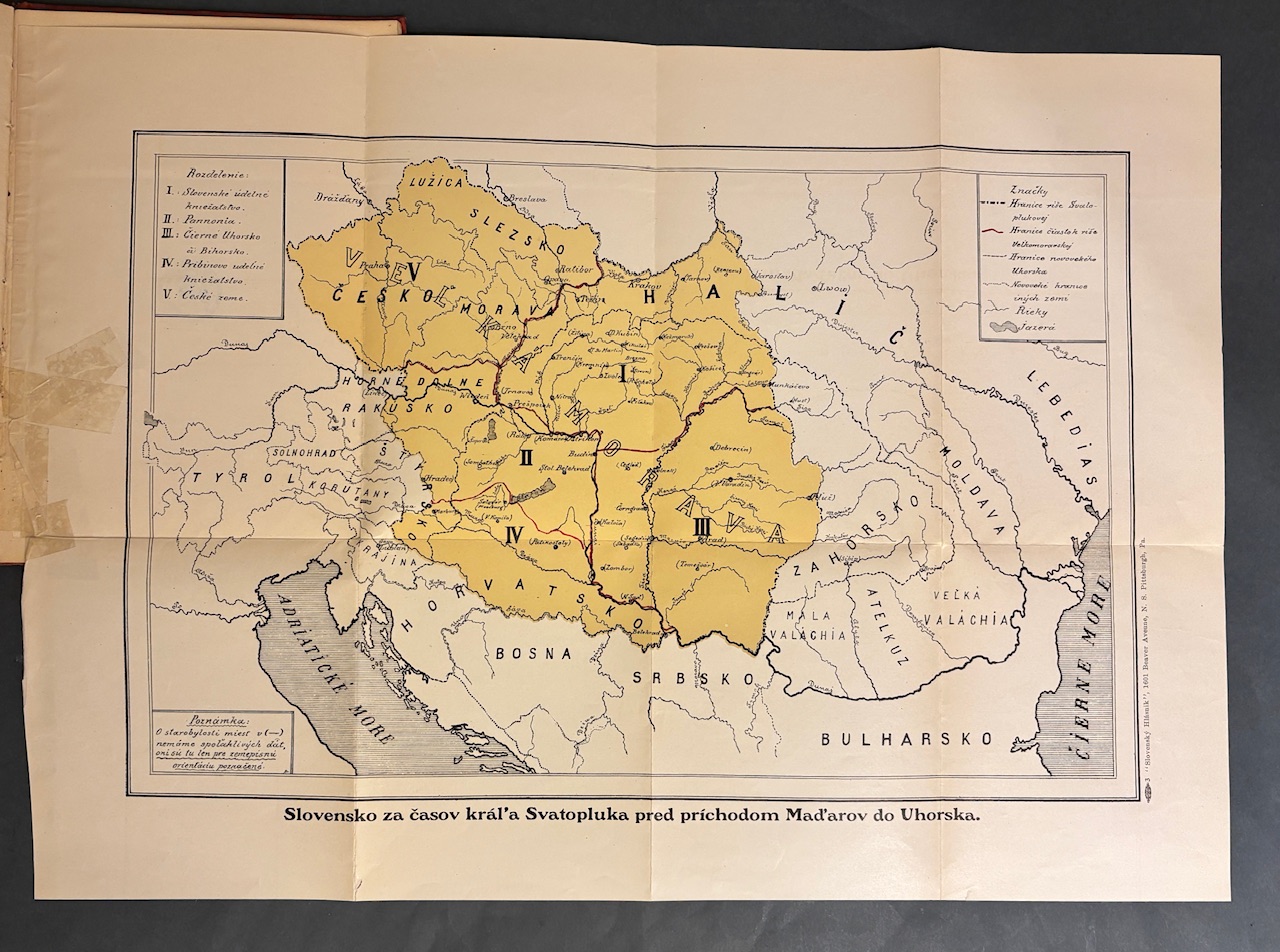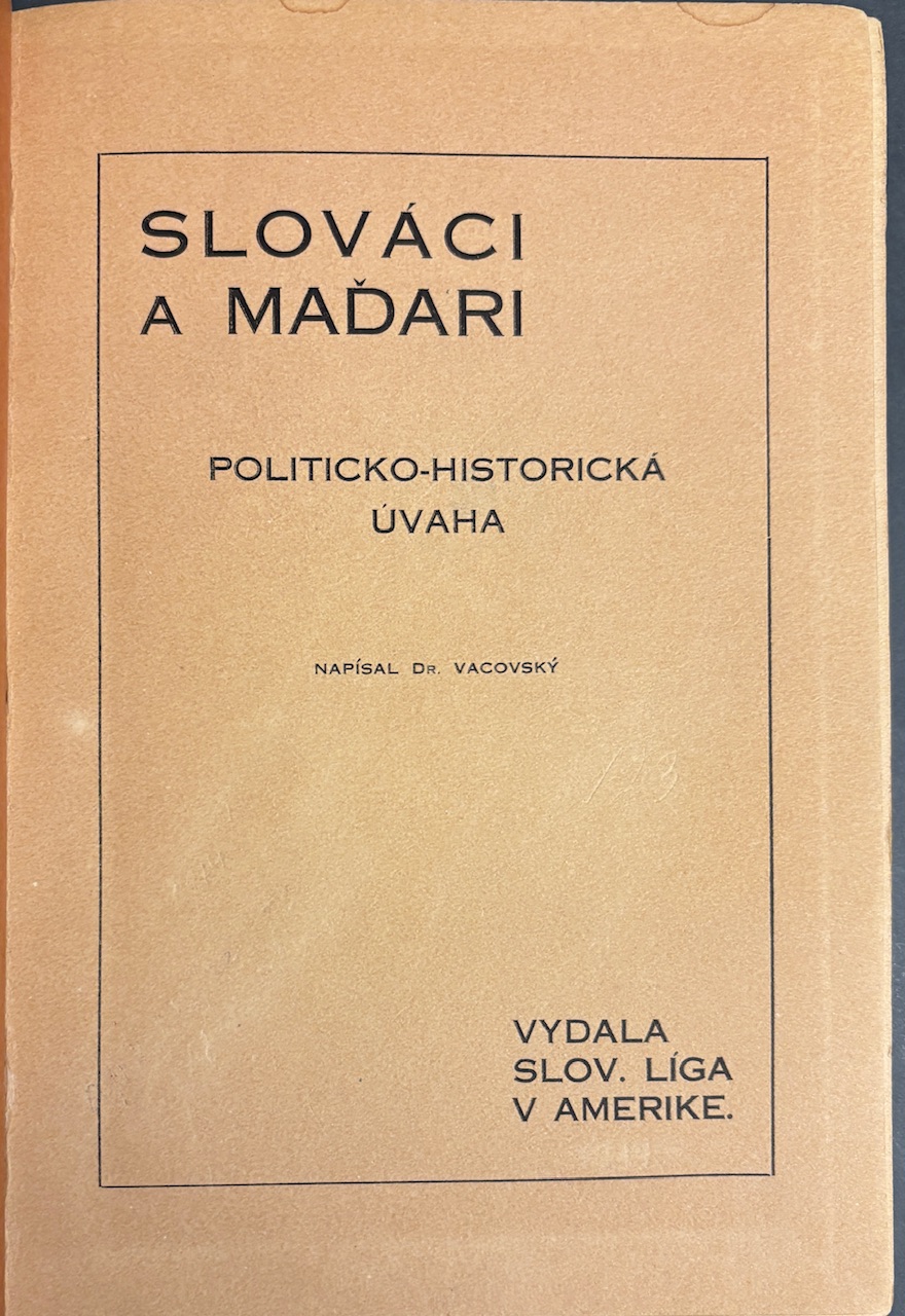 Politicko-historická esej určená pre slovenskú komunitu v USA, analyzujúca vzťahy medzi Slovákmi a Maďarmi v období krátko pred vznikom Československa. Text reaguje na situáciu Slovákov v Uhorsku, na maďarizačný tlak a na národno-emigračné hnutie v Amerike. Kniha patrí do radu propagandistických, osvety a politických spisov Slovenskej ligy v Amerike, ktorá podporovala ideu sebaurčenia Slovákov a neskôr vznik ČSR. Autor Milan Ivanka (1885-1959) bol slovenský politický publicista, právnik, aktivista Slovenskej ligy v Amerike a významná osobnosť slovenského krajanského hnutia v USA v prvej polovici 20. storočia. Pred 1. svetovou vojnou patril medzi mladú slovenskú inteligenciu kritickú k maďarizačnej politike Uhorska. Na začiatku 20. storočia emigroval do USA, kde sa zapojil do krajanského život. Pseudonym Dr. Vacovský používal v publicistike, najmä pri politických textoch adresovaných Slovákom v USA.- 1. americké vydanie, hoci prvý raz uverejnené v "Slovenskej čítanke" Moravsko-slezskej besedy v Prahe 1911,- 1 rozkladacia príloha - Mapa "Slovensko za časov kráľa Svätopluka", uchytenie mapy na jednom mieste opravované starou izolepou.- Staré knižničné pečiatky a zápis Vyradené na rube titulného listu a niekoľko pečiatok a zápisov priebežne v knihe, väzba rozheganá, bledý fliačik v hornej časti
