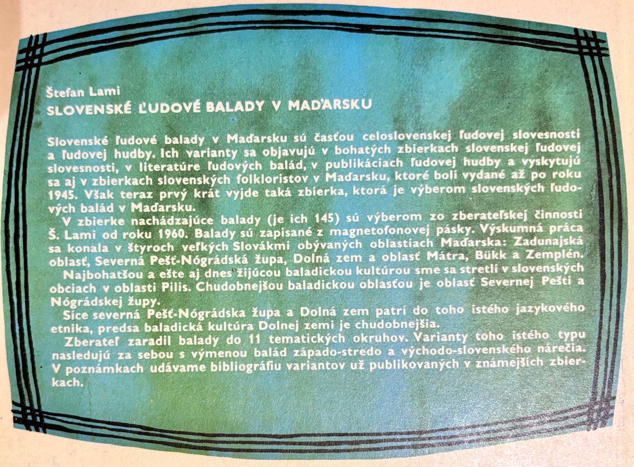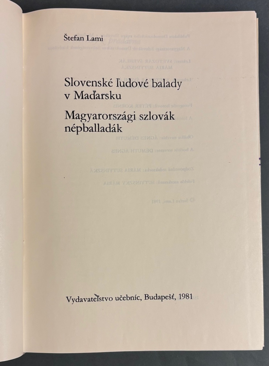 Publikácia Demokratického zväzu Slovákov v Maďarsku.- 1. vydanie.- Balady a notový materiál k baladám.- ČB ILU (ukážky slov. ľud. umenia a kroja).- Horná oriezka trochu fľakatá, inak veľmi pekný stav