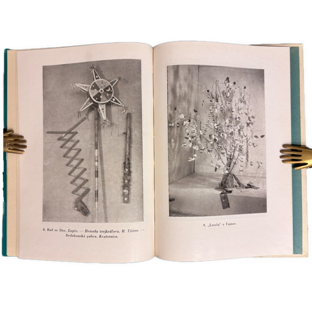 ZAUJÍMAVOSŤ: Vydané v roku 1942 s označením „Made in Slovakia“ – v období existencie Slovenského štátu. Ide o jednu z publikácií, ktoré sa pokúšali systematicky uchopiť slovenskú kultúrnu identitu cez výtvarné a zvykoslovné pramene. Na zadnej doske sa nachádza dobová cenová pečiatka Povereníctva Slovenskej národnej rady pre výživu a zásobovanie so zľavou 25 %, pravdepodobne súvisiaca s povojnovou cenovou reguláciou a korekciou meny pri redistribúcii knižných zásob