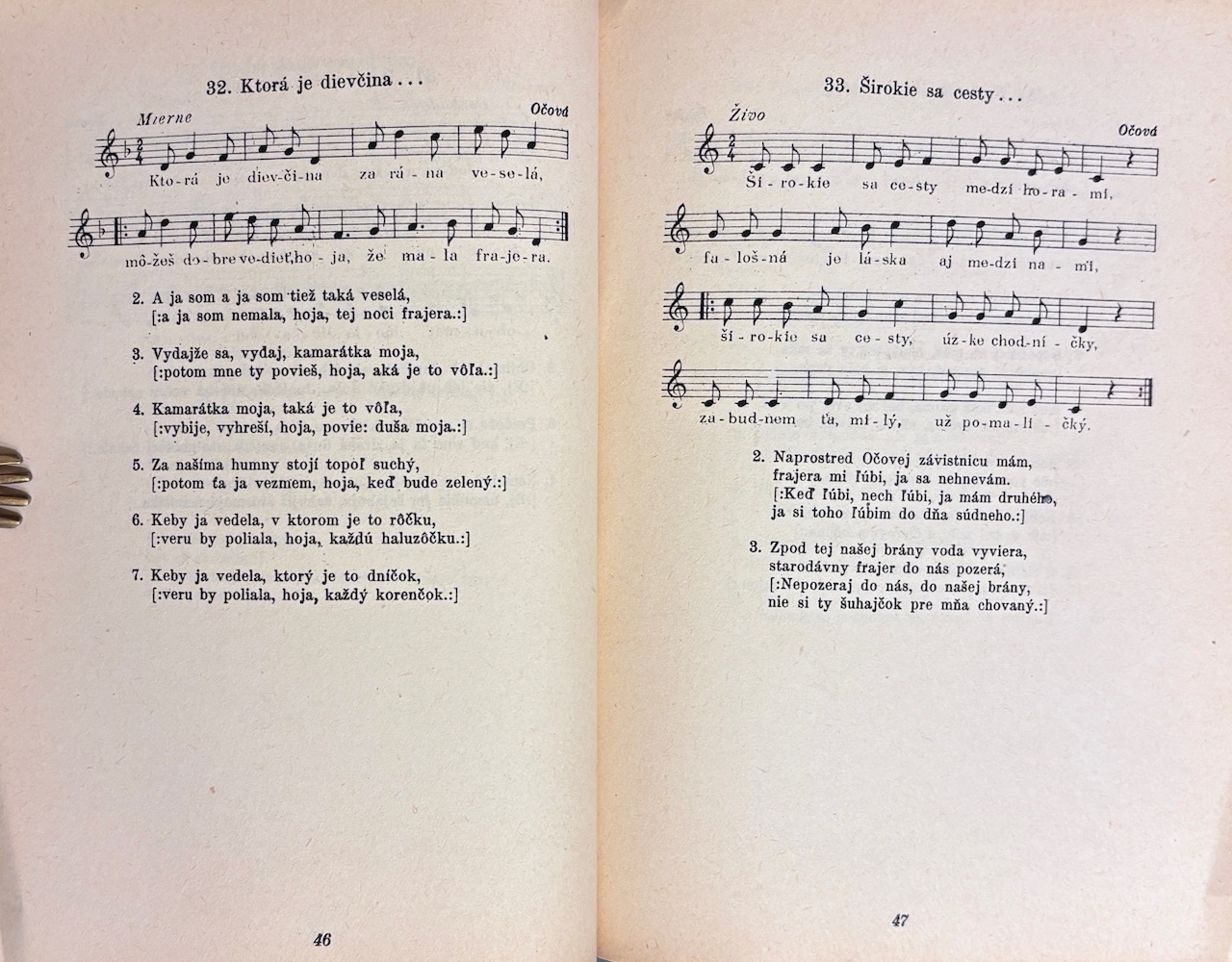 180 spevov (notový záznam a texty) zo zápisov Janky Guzovej, Janka Matušku a Pavla Tonkoviča, podľa charakteru uspávanky, krstinové, regrútske, svadobné, tanečné, trávnice, valaské, sociálne a.i.- 2. vydanie.- Predná strana väzby s dolným oslím rohom, trošku zaprášená, inak dobrý stav