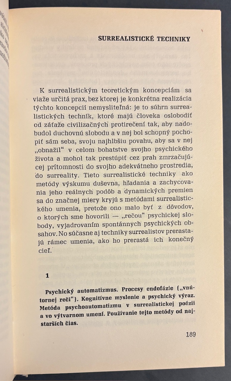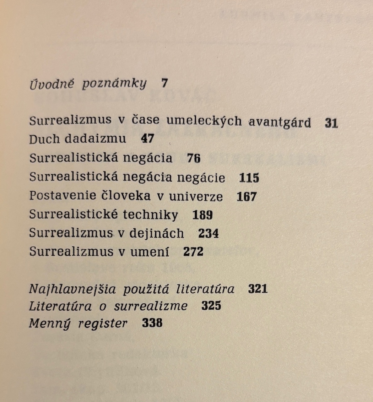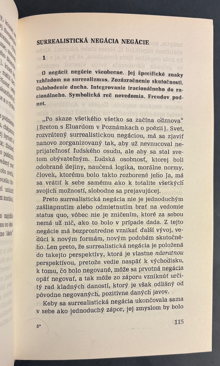 Princípy a „osudy“ svetového surrealizmu, jeho ideové zdroje a estetické východiská. Surrealizmus tu nie je chápaný len ako umelecký smer, ale ako širšie hnutie s ambíciou riešiť základné existenciálne otázky moderného človeka. Dôležitá je aj línia „oslobodenia“ človeka cez poéziu: odhaľovanie a využitie hlbinných zdrojov psychiky, racionalizovanie „iracionálneho“ a sprístupnenie sveta nevedomia, pričom teória má podporovať (nie brzdiť) básnickú prax. Surrealizmu je predstavený ako najhlbšia a najpríťažlivejšia „antropologická“ doktrína moderny, ktorá si drží aktuálnosť.- 1. a jediné vydanie knihy.- Ed. Horizonty, zv. 13.- 10 ČB obrazových príloh.- Papierová obálka po okrajoch len minimálne ošúchaná, knižný blok jemne skosený