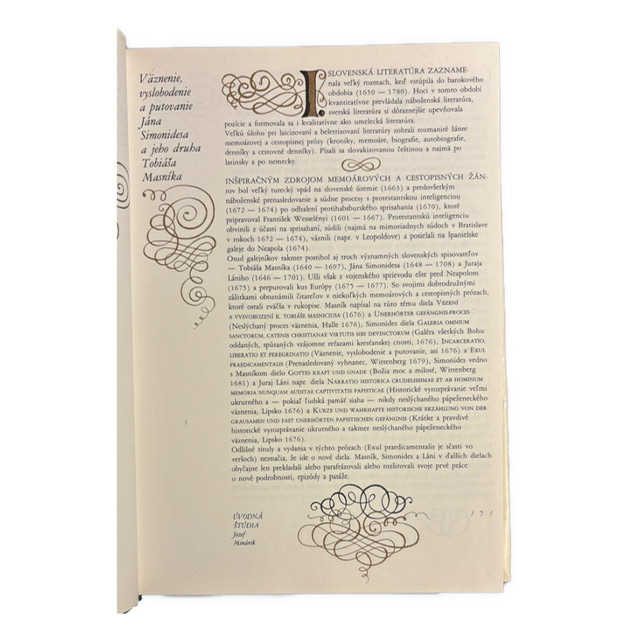 Výnimočné literárno-historické svedectvo o osudoch slovenských protestantských vzdelancov, ktorí sa po odhalení Wesselényiho sprisahania stali obeťami protihabsburských procesov, väznenia a deportácií na španielske galéry. Texty Jána Simonidesa a Tobiáša Masníka zachytávajú skúsenosť väzenia, útek z vojenského sprievodu a dlhé putovanie naprieč Európou – od Uhorska cez Rakúsko, Taliansko, Nemecko až po Švajčiarsko a Poľsko. Ide o barokové memoárové a cestopisné prózy mimoriadnej výpovednej hodnoty, v ktorých sa naturalistické opisy mučenia a poníženia striedajú s reflexiou viery, slobody, krajiny a kultúrnej rozmanitosti Európy 17. storočia. Autentickosť textu podčiarkuje fakt, že diela vznikali z denníkových záznamov a dlhý čas prežívali len v rukopisnej tradícii. Moderné knižné spracovanie z roku 1981 predstavuje vzorový príklad kultivovanej edície: kvalitná tlač, premyslená grafika, barokizujúca ornamentika a bohaté obrazové prílohy s reprodukciami dokumentov, titulných listov a dobových rytín robia z knihy nielen čitateľský, ale aj vizuálny zážitok. Odporúčame historikom, literárnym historikom, študentom katedier slovenských dejín, zberateľom slovacík a všetkým, ktorí sa zaujímajú o staršiu slovenskú literatúru, memoárové pramene alebo ako dar pre tých, ktorí majú z histórie už veľa, no po autentických textoch a dobových prameňoch stále radi siahnu