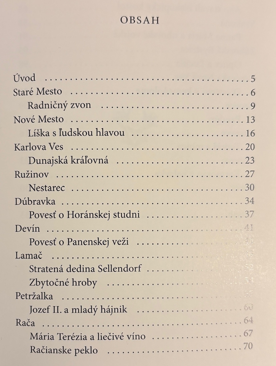 Výpravná a obrazotvorná kniha, ktorá rozpráva tajomné príbehy starých bratislavských štvrtí, ulíc a zákutí – od Starého Mesta, Devína, Rače či Petržalky až po Rusovce, Jarovce a Čunovo. Autorka oživuje dávne legendy, povesti a zabudnuté rozprávania, v ktorých sa mieša história s fantáziou, realita s čarom a každodennosť s nadprirodzenom. Poetický sprievodca Bratislavou, pre deti i dospelých - ideálna kniha pre čitateľov, ktorí hľadajú Bratislavu, akú nepoznajú.- Dobové fotografie a čarovné farebné ilustrácie Kataríny Slaninkovej.- Pekný stav