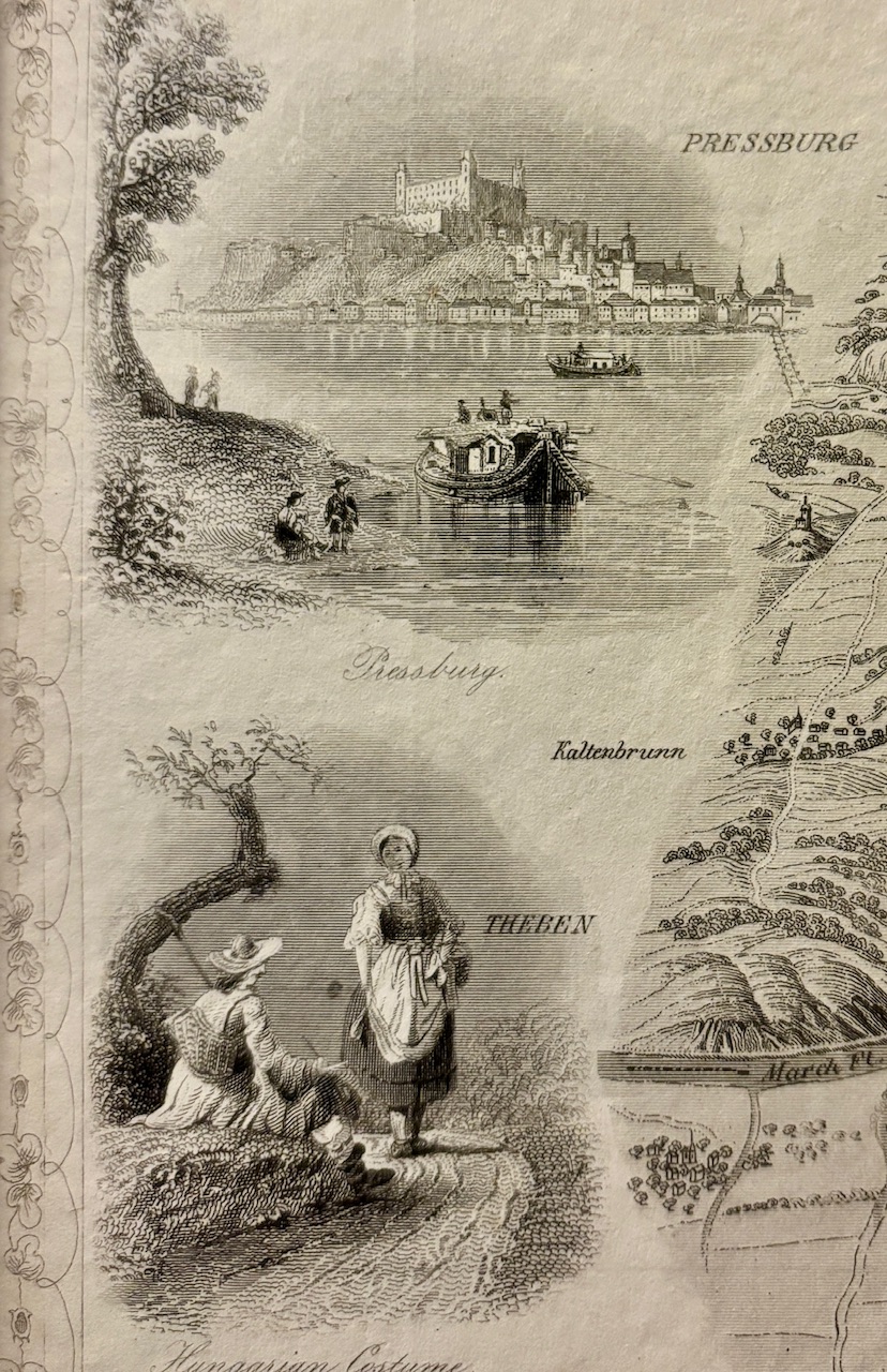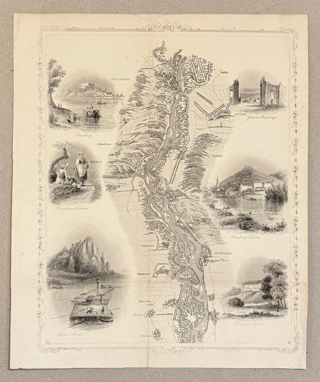 Originálny oceloryt z 19. storočia. Okrem toku rieky s okolitými dedinami v ich pôdoryse, zobrazuje pohľady na príslušné mestá a dediny, cez ktoré Dunaj preteká. Vyobrazenie Petronellu, Devína, devínskych krojov, Hainburgu, panorámy Bratislavy a Viťaznej brány na Bratislavskom hrade.- Biela hrubšie pasparty 31 x 36,5 cm, rozmer listu 22 x 26,5 cm.- Pekný stav