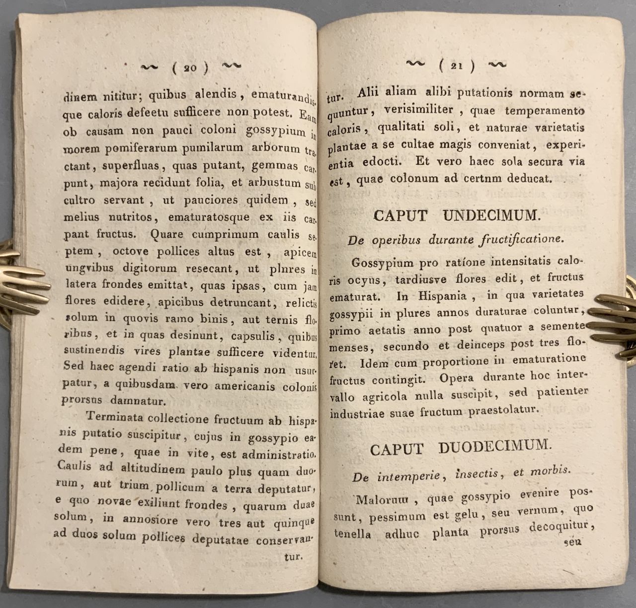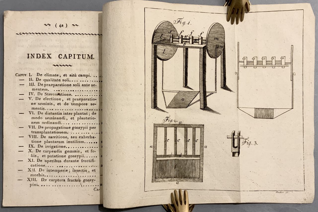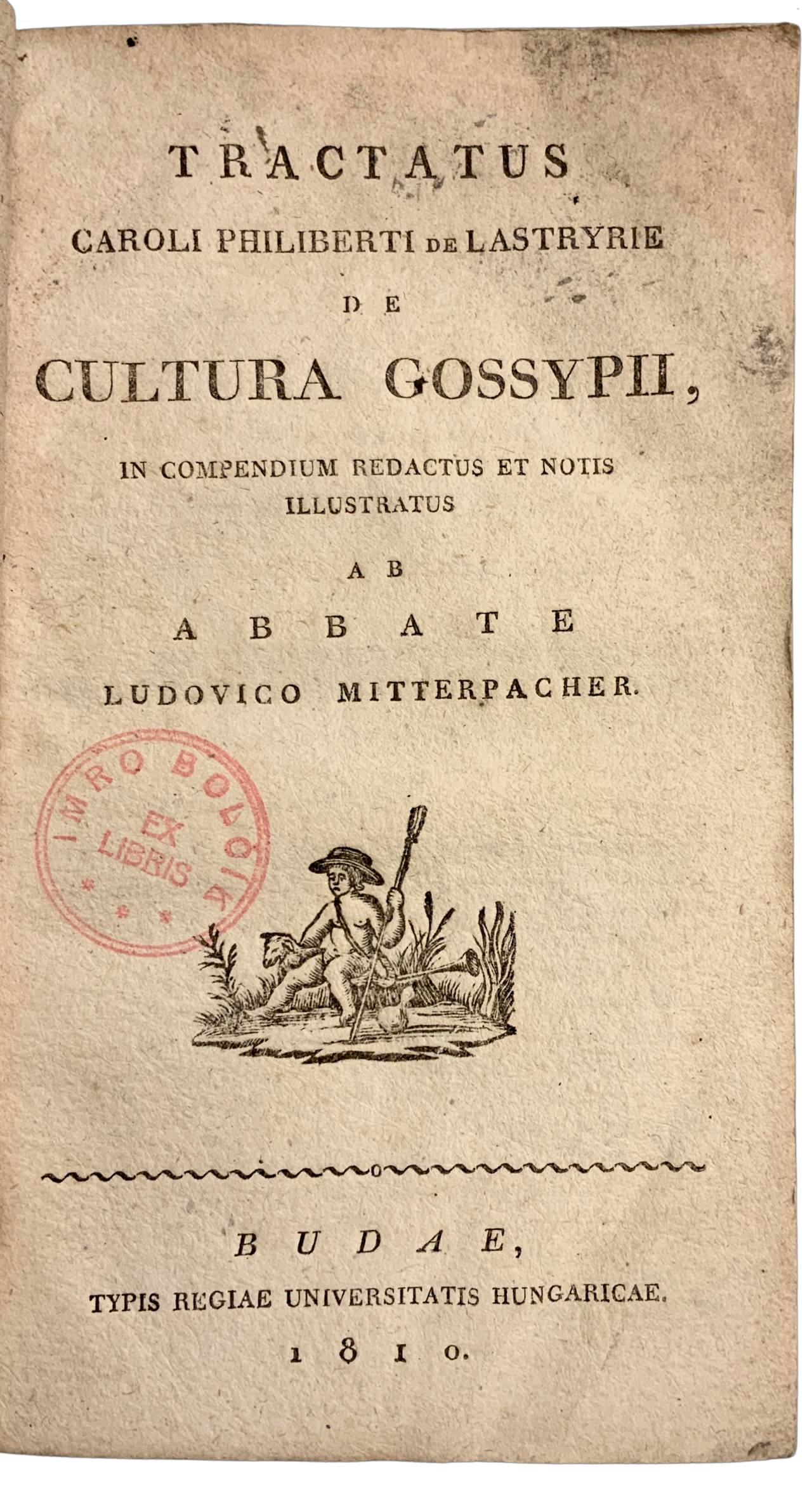 Vedecká príručka so základnými poznatkami pestovania bavlny od francúzskeho agronóma, priemyselníka, filantropa, ale aj litografa Charlesa-Philiberta de Lasteyrie (1759-1849). Skladaný mediryt na konci knihy.- Exlibris pečiatka na titulnom liste a na str. 23.- Jednoduchá brožovaná väzba, malá dierka na chrbáte, oslie uši, poslednej strane chýba kúsok horného rožka (nezasahuje do textu).