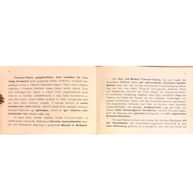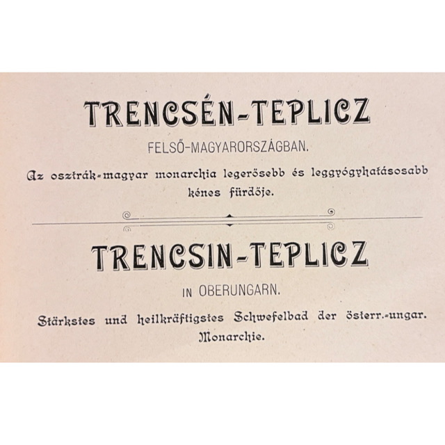 Dvojjazyčný reklamný album predstavuje kúpele Trenčianske Teplice v období Rakúsko-uhorskej monarchie ako jedno z najvýznamnejších liečebných a spoločenských centier regiónu. Na 19 stranách textu v maďarčine a nemčine približuje liečivé účinky sírnych prameňov, priaznivú klímu i komfort kúpeľného pobytu, pričom zároveň slúži ako dobová marketingová publikácia zameraná na návštevníkov z celej monarchie.