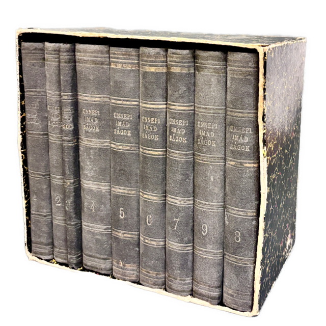 Kompletná séria (1-9) sviatočných modlitieb usporiadaných podľa chrámového poriadku, s paralelným maďarským prekladom. Liturgické vydanie určené pre synagogálne použitie počas hlavných sviatkov židovského roka (Pesach, Jom Kipur, Sukkot a ďalšie). Tlač pochádza z prostredia významnej viedenskej židovskej komunity.