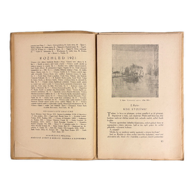 Súbor obsahuje 12 čísel v 5 zošitoch a okrem textov a menších reprodukcií prináša aj originálne grafické listy (linoryty, drevoryty a litografie) autorov, ktorí formovali podobu českej moderny po roku 1918.