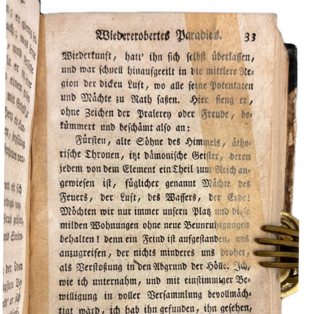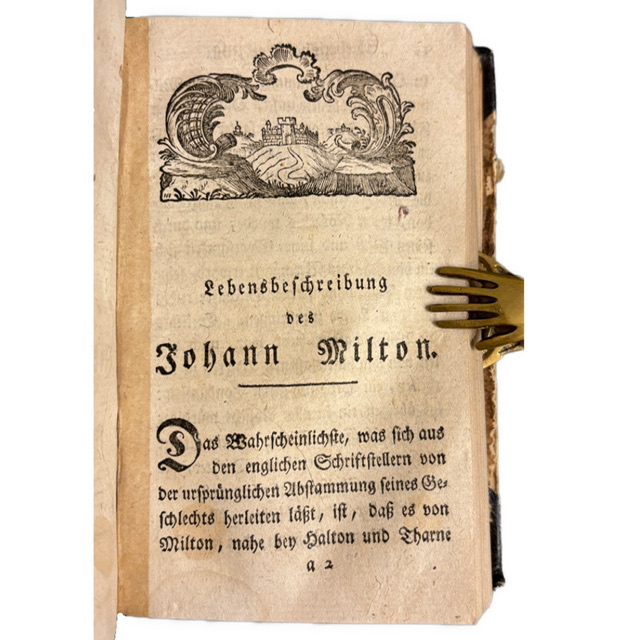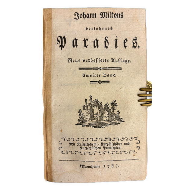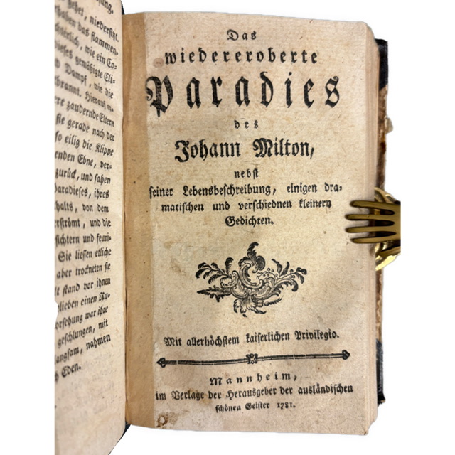 Mannheim: Im Verlage der Herausgeber der ausländischen schönen Geister, 1781–1783 (Bd. I 1783, Bd. II 1781). Umfang: 272 + LXI + 302 Seiten. Gebunden in späterem Ledereinband mit marmorierten Deckeln; Frontispiz (Porträt Miltons), typographische Zierstücke. Alter Exlibris-Eintrag auf dem Titelblatt, S. 33 im 2. Teil geklebt, Einband berieben.