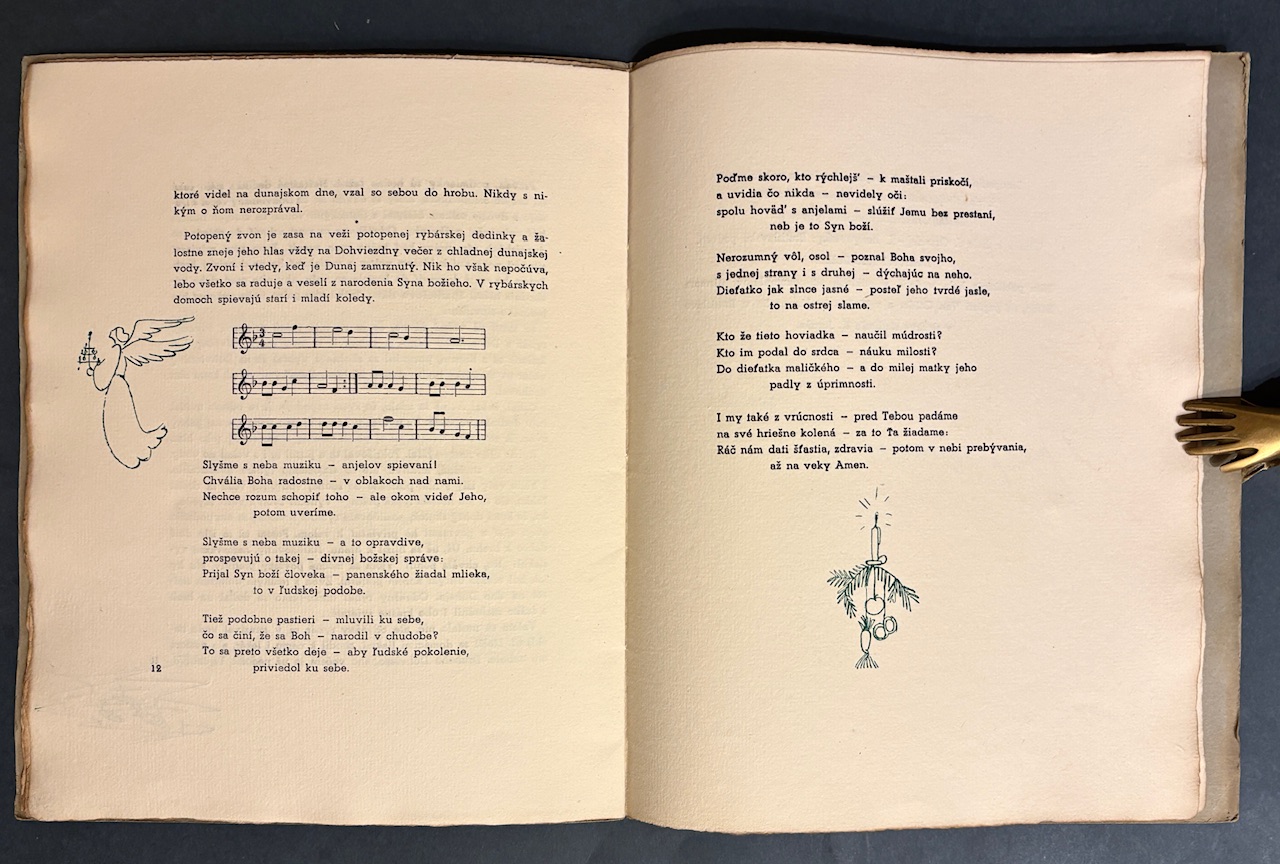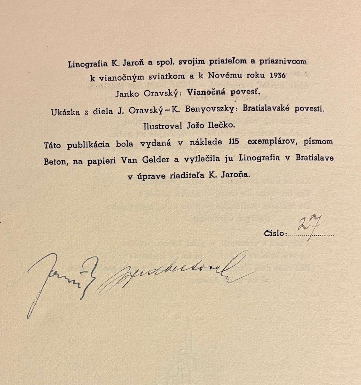 Príležitostná vianočná bibliofíia vydaná Linografiou K. Jaroňa ako novoročný pozdrav pre priateľov a spolupracovníkov roku 1936. Text Janka Oravského je spracovaný ako lyrická vianočná próza, doplnená na úvodnej dvojstrane celostranovou farebnou ilustráciou Joža Illečka, signovaná v tlači a po stranách textu dekoratívnymi kresbami ilustrátora.- Dielo predstavuje reprezentatívny príklad bratislavskej predvojnovej bibliofílie, t.j. malý náklad, kvalitný holandský papier Van Gelder, ručná úprava, umelecká ilustrácia a vysoká remeselná úroveň tlače.Bibliofilské vydanie v náklade 115 exemplárov, tento výtlačok č. 27., s vlastnoručným podpisom riaditeľa K. Jaroňom a ďalším pracovníkom linografie.- Väzba po stranách len minimálne zažltnutá, sotva viditeľné oslie rožky, inak výborný stav