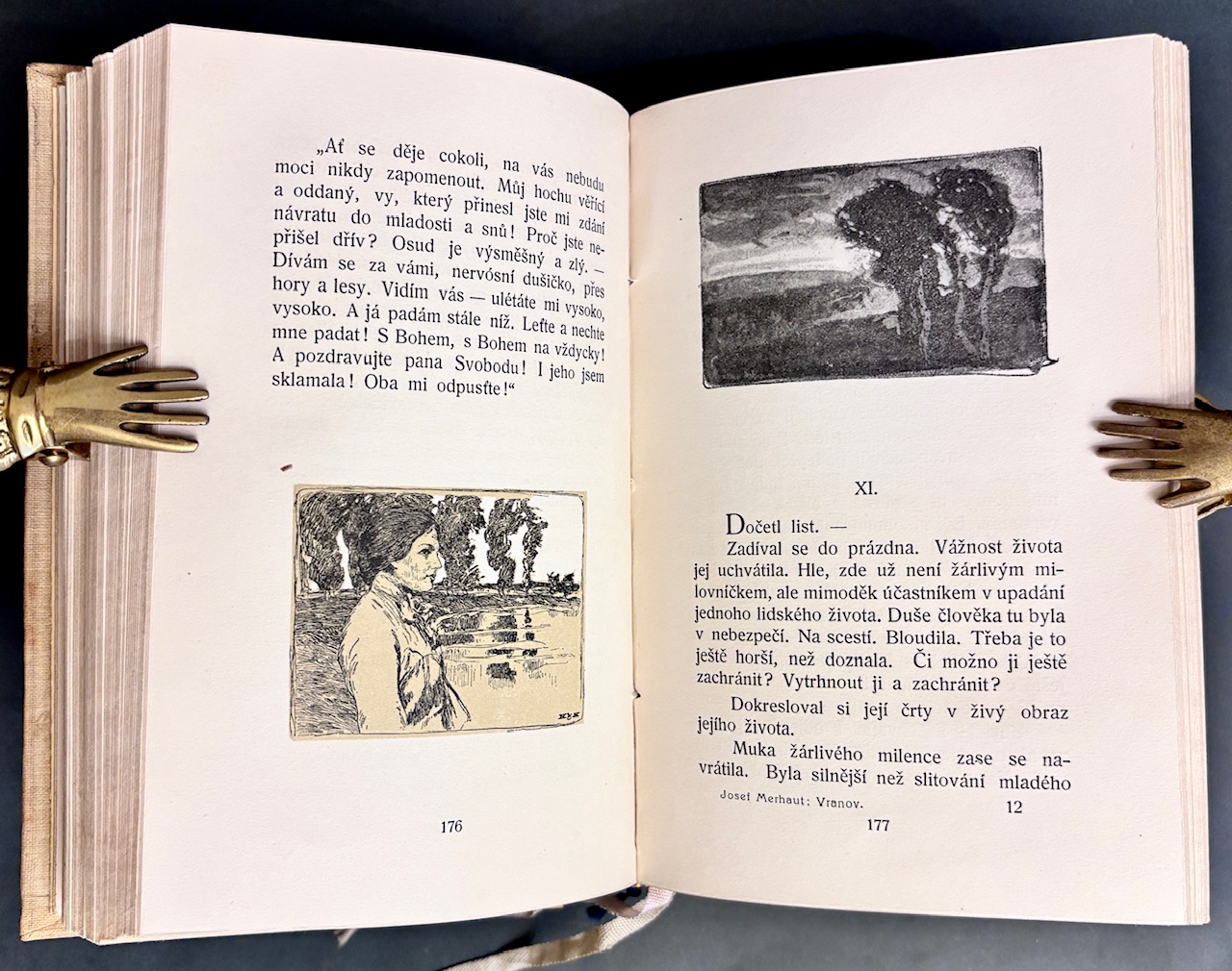 Realistické a naturalistické zobrazenie sociálnych a národnostných problémov Brna 19. a 20. storočia. Ilustrácie Výzdobu knihy navrhol český maliar Alois Kalvoda (1875–1934), predstaviteľ secesného krajinárskeho maliarstva, známy svojím osobitým dekoratívnym štýlom. Väzba knihy s rastlinnými a geometrickými ornamentmi je typickým príkladom secesného dizajnu z tohto obdobia. Zlatoriezka.- Chránené kartónovým obalom.- Chrbát s mini fliačkami, inak pekný stav